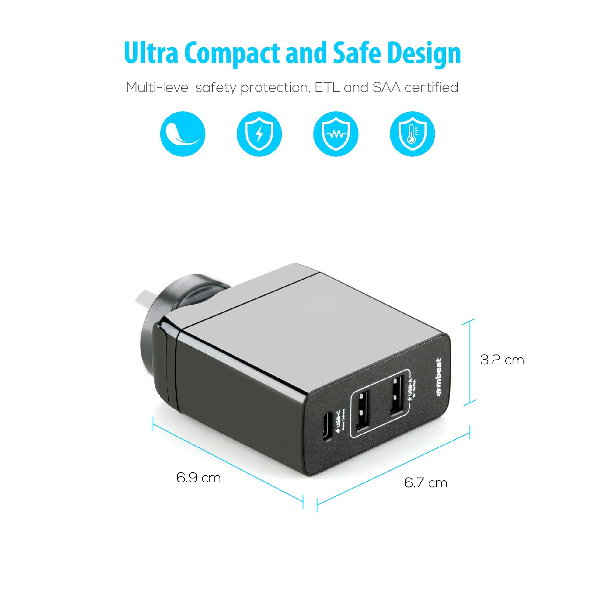 mbeat Gorilla Power 3-Port USB-C Power Delivery (PD) World Travel Charger (USB-C x 1, USB-A x 2) with Interchangeable Plugs