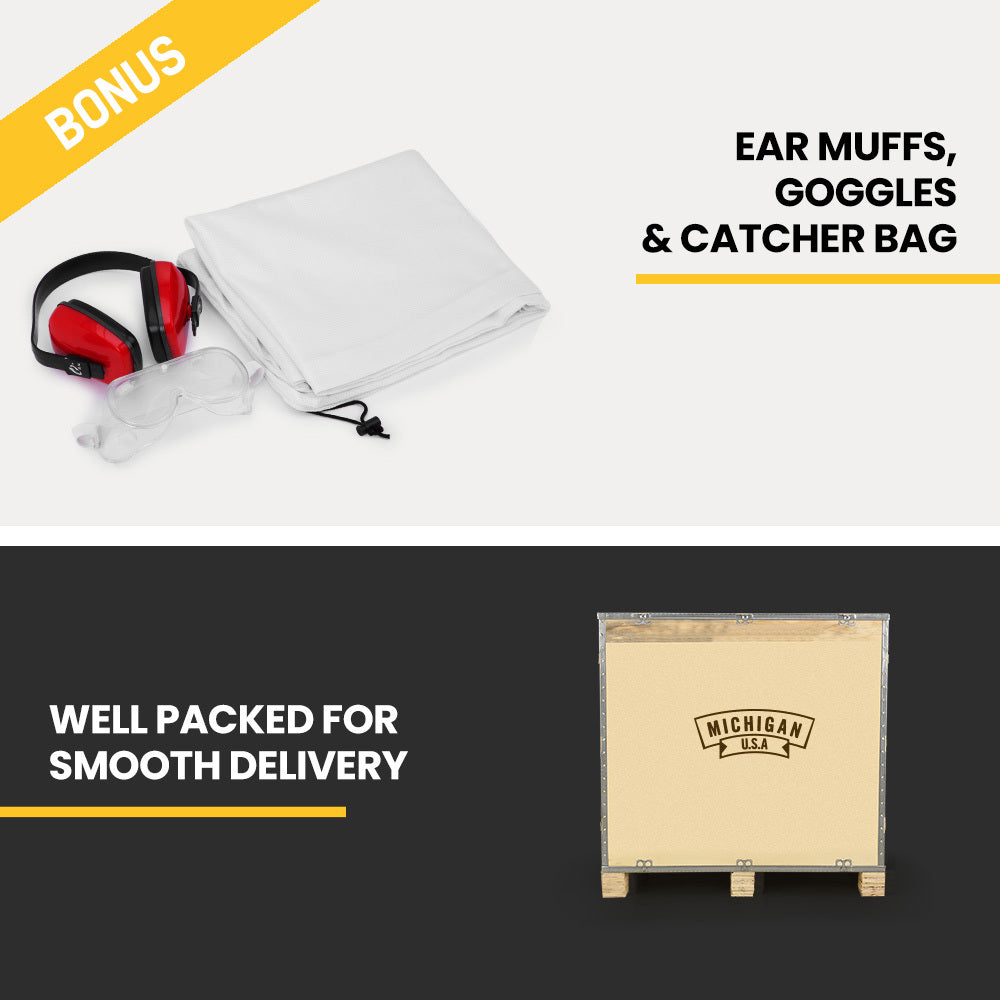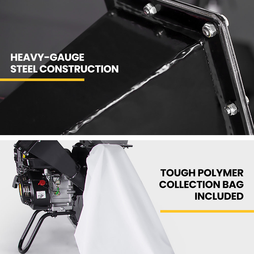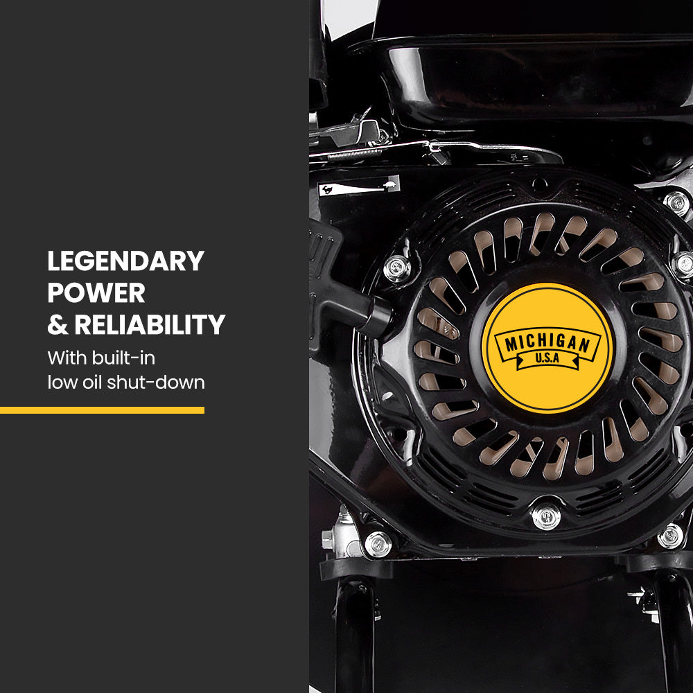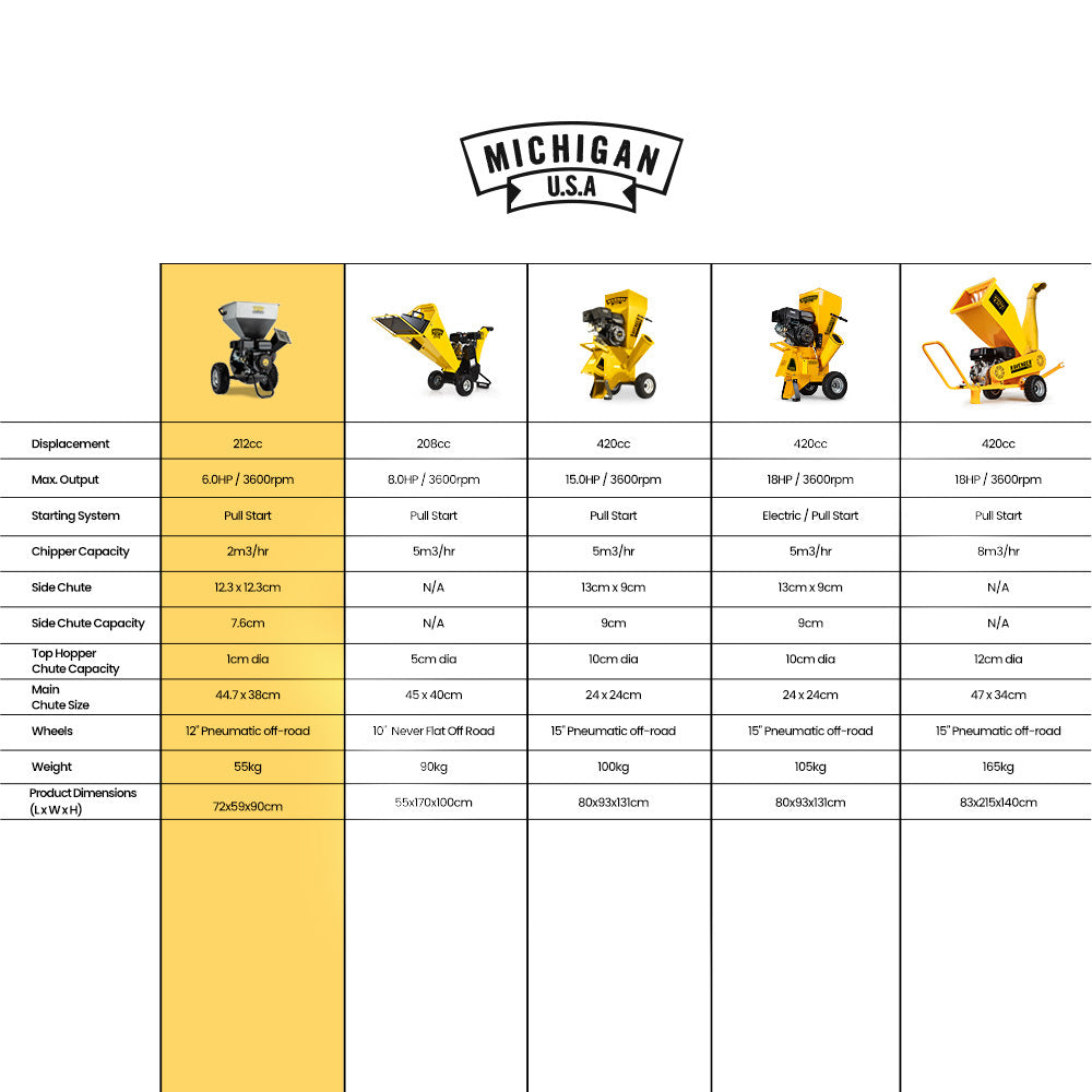 The Michigan Raptor 950 2-in-1 Portable Wood Chipper/Shredder features an innovative self-feeding upright design and is ideal for large property owners, keen gardeners or commercial landscapers. The 212cc OHV engine delivers the massive six horsepower of chipping power via a patented DirectDrive design. This means maximum efficiency with minimal stress on components, and does away with the need for belt replacement!