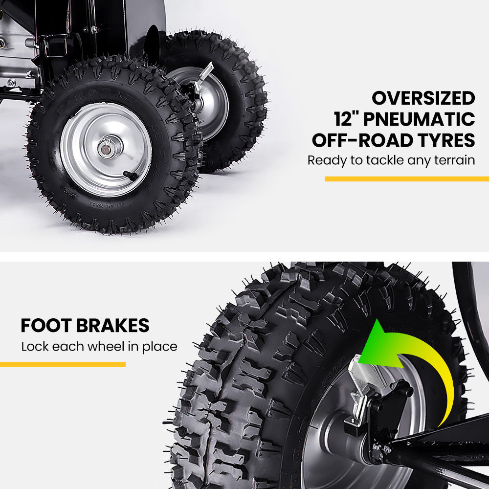 The Raptor 950 Wood Chipper boasts world-class heavy-gauge steel construction that ensures excellent durability and portability. Oversized all-terrain 12 inch pneumatic wheels provide easy mobility and dual foot brakes lock it into position. It’s shipped in a tough reinforced crate and minimal assembly is required - you’ll be making fast work of large or small yard debris in no time!