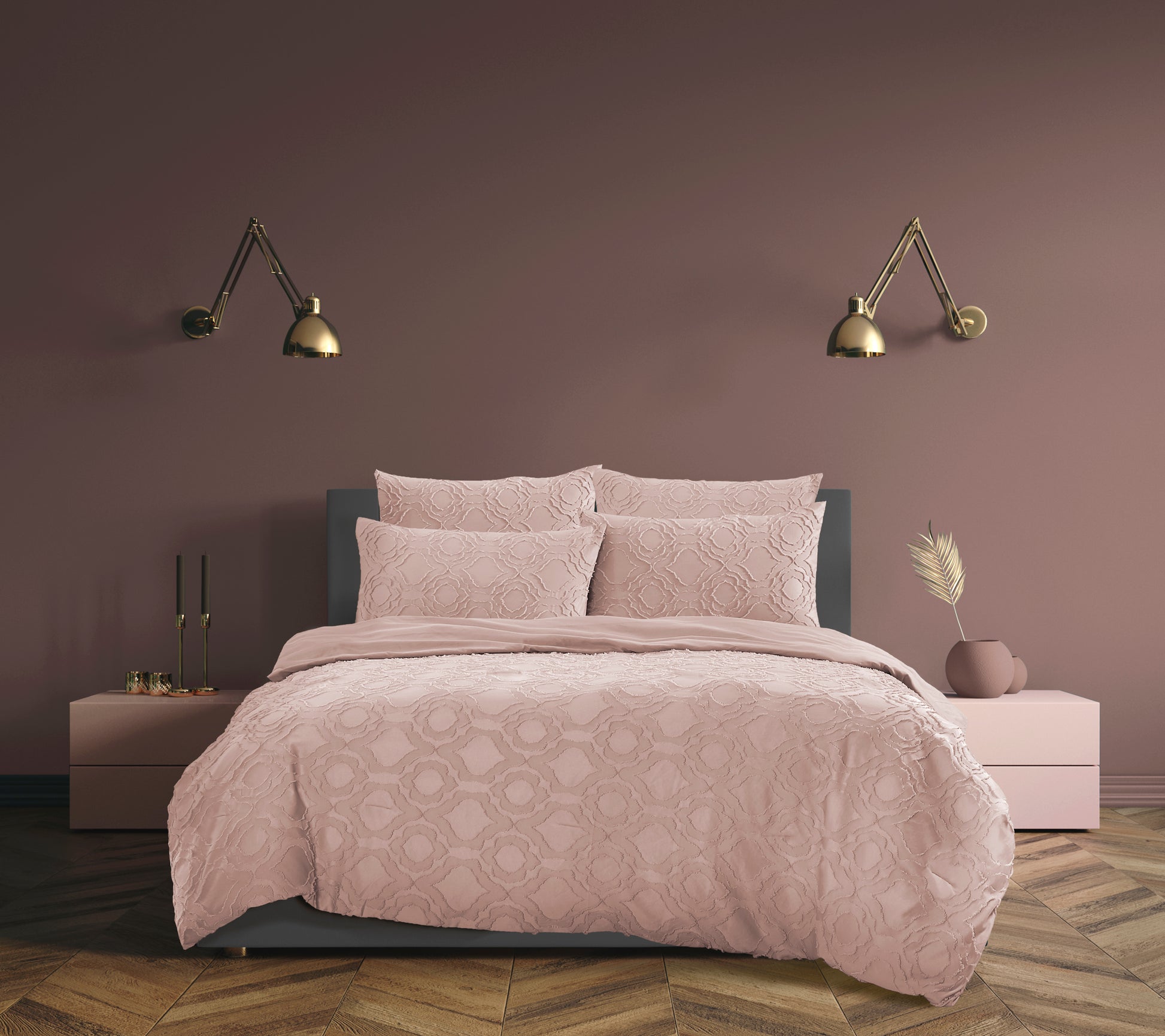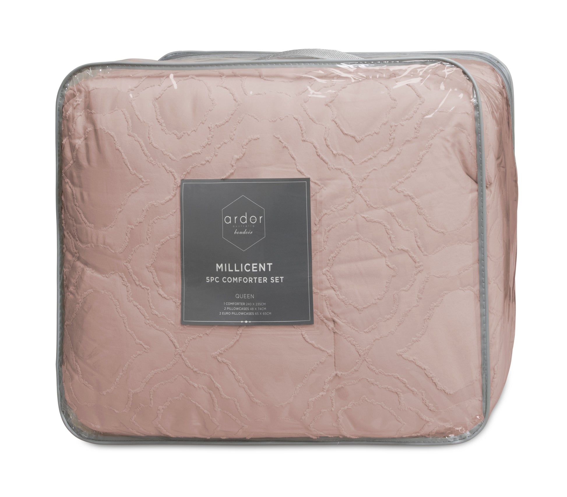 illicent�s peachy front displays a tufted pattern that softly gestures inspiration from floral tiles with a plain dyed reverse. This comforter set consists of 5 pieces - 1 x Comforter, 2 x Standard Pillowcases and 2 x European Pillowcases that will completely transform the bedroom aesthetics into tranquility.