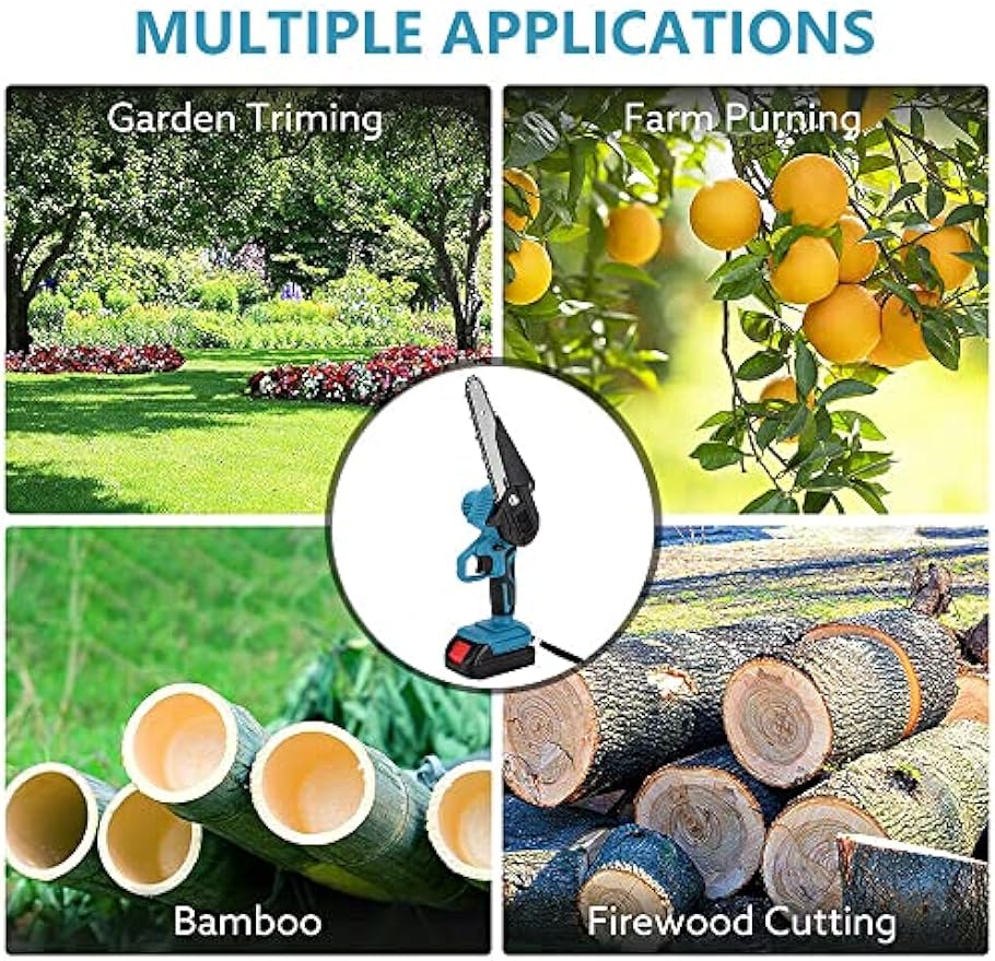 - 【Wide Application】Our cordless chainsaw is very suitable for gardening pruning, bush pruning, small branch pruning, woodcutting, It is widely used in gardens, parks, farms, pastures, orchards and greenhouses. Perfect tree pruner. (Please make sure the chain is tightened before use.)