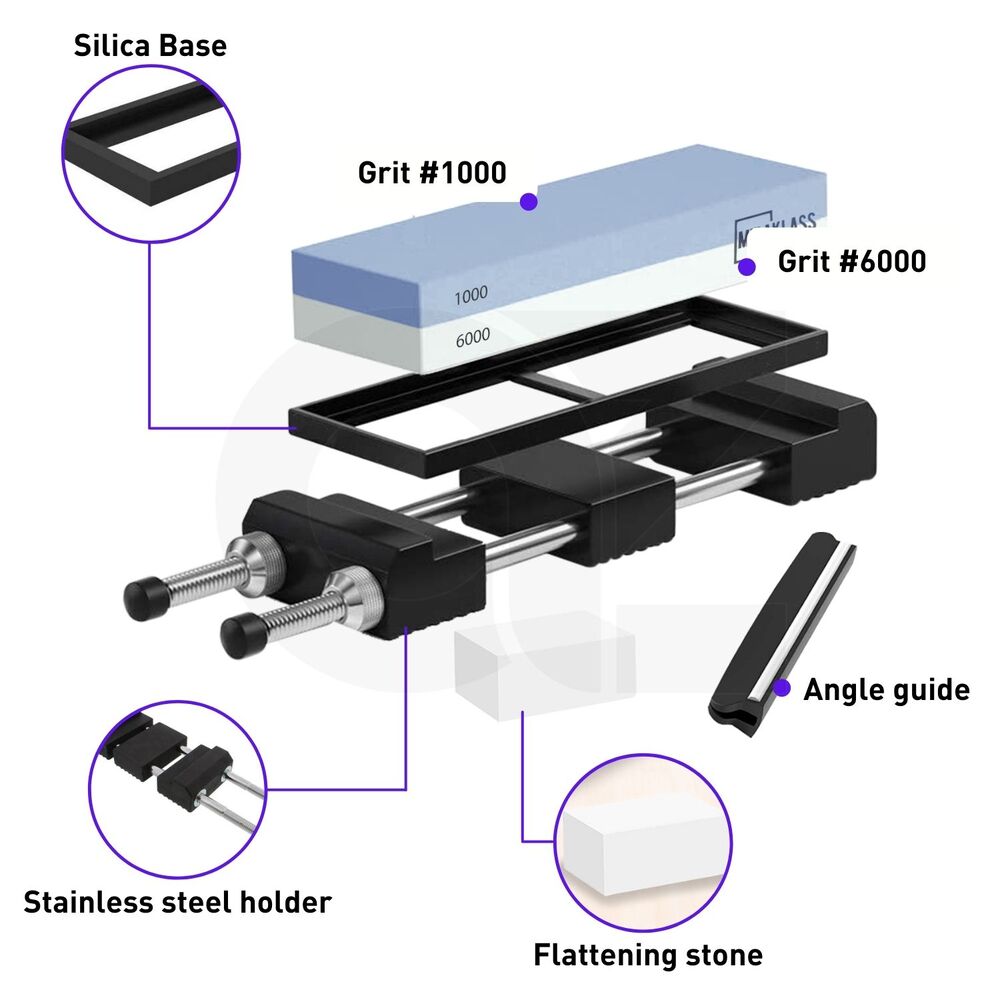 1 whetstone, 1 silica base, 1 angle guide, 1 stainless steel holder, 1 flattening stone and an instruction manual are included.