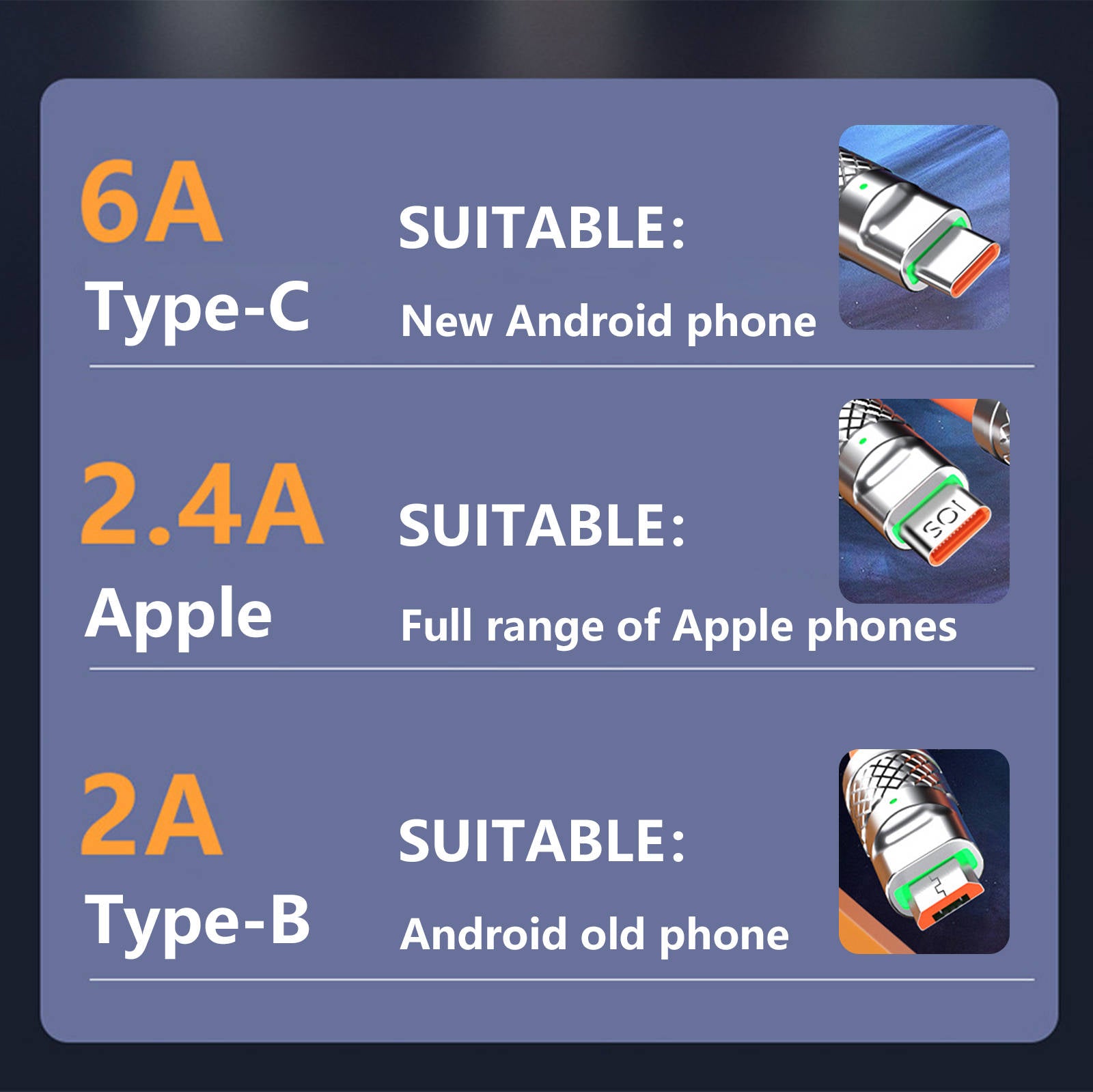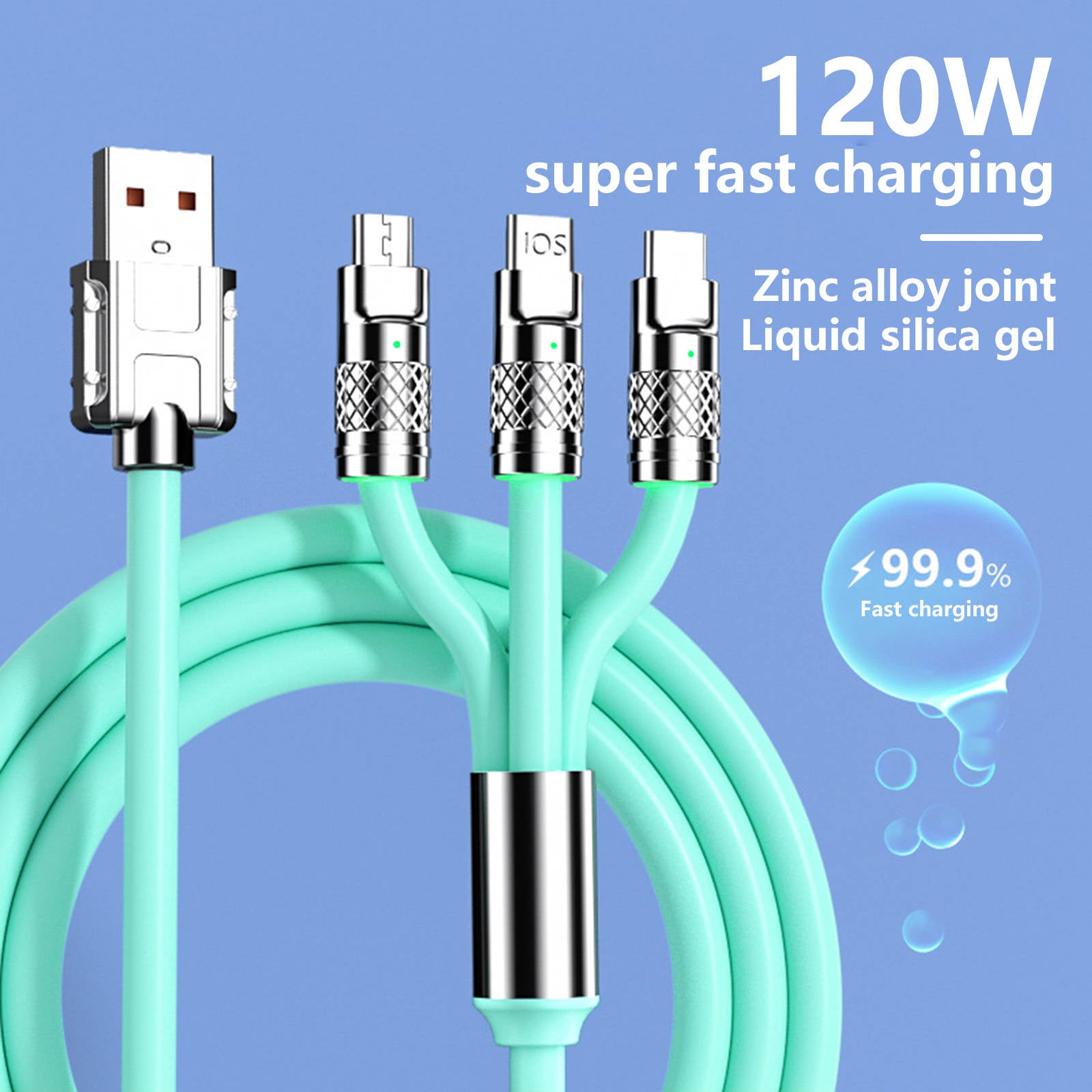 This 3-in-1 USB cable is an all-in-one solution for charging your mobile devices. The versatile design includes micro USB, Type-C, and iPhone connectors, allowing you to charge a variety of devices with just one cable. The compact and lightweight design makes it easy to take with you on the go, ensuring you have a reliable charging solution no matter where you are