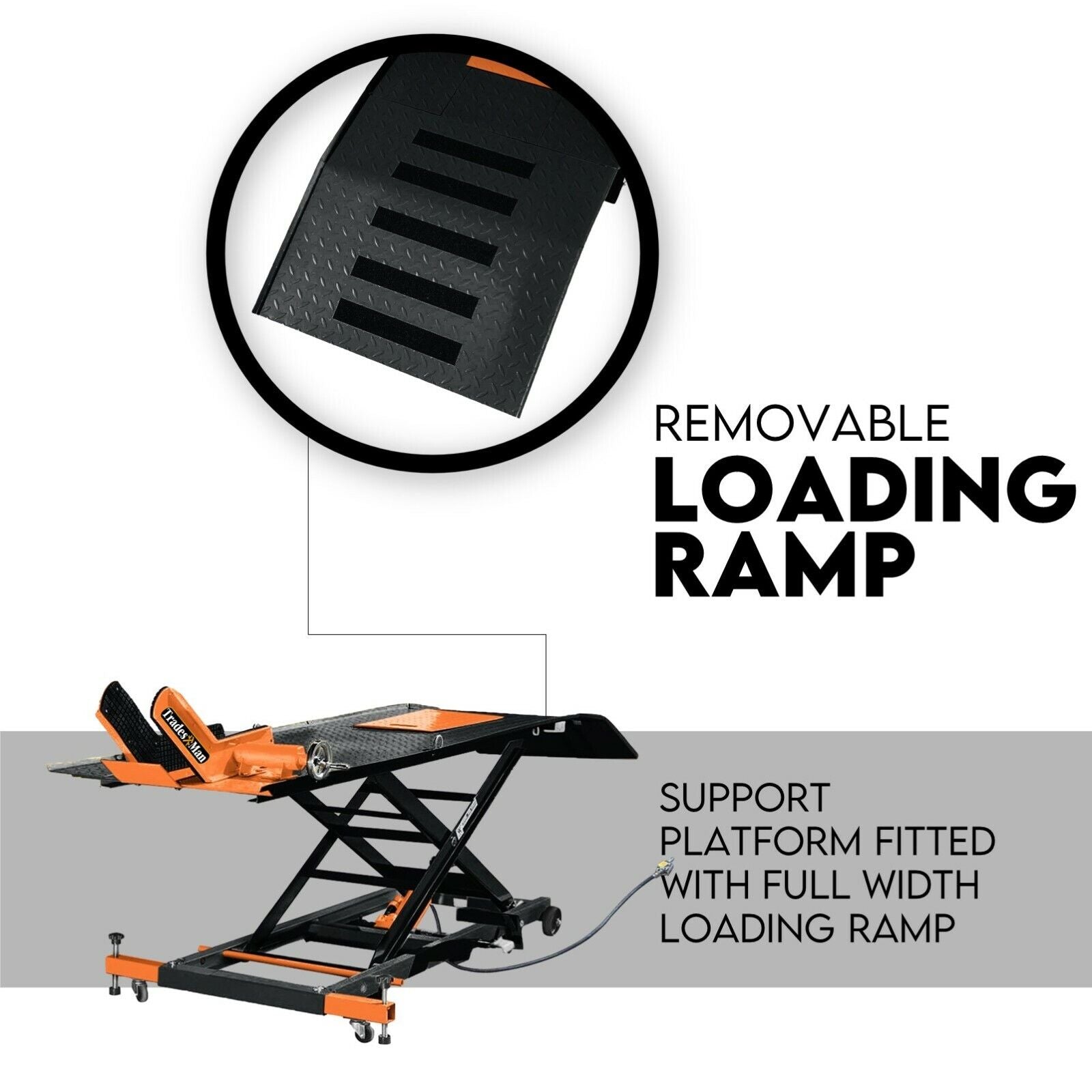 This premium model has a 1800mm long platform table and a 690mm approach ramp. It also has a 45-degree front wheel clamp along with the four tie-down points to prevent the bike's unwanted movement.