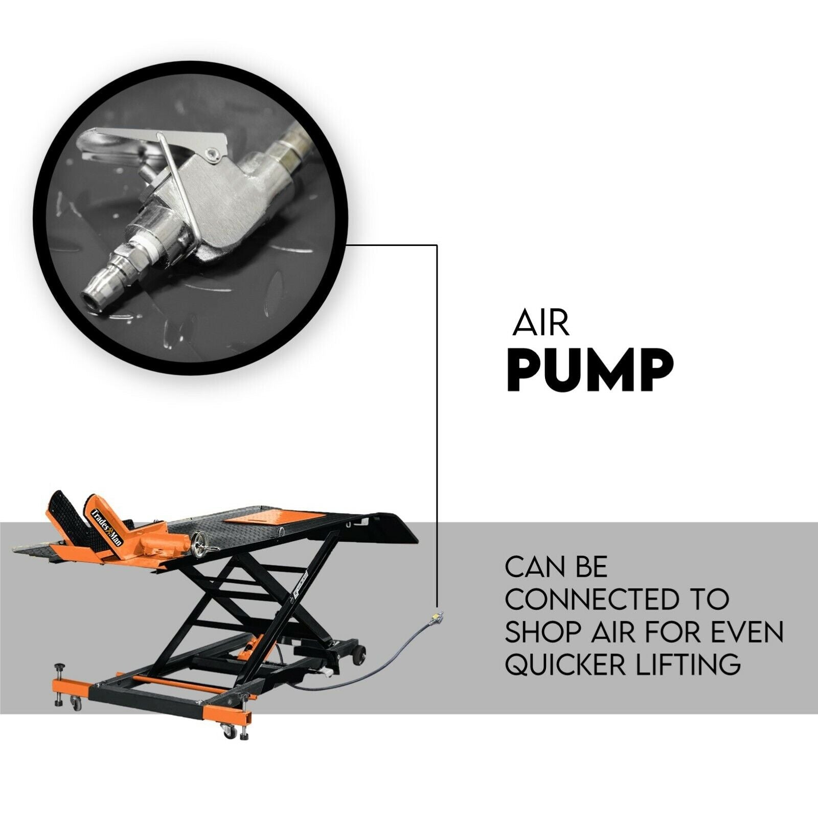 The Tradesman Air/Hydraulic Motorcycle Lift and Stand is a great value -- stacked with features typically found on more expensive lifts. It quickly lifts motorcycles (up to 1,000 Lb) with the convenient pump pedal. It can also be connected to shop air for even quicker lifting.