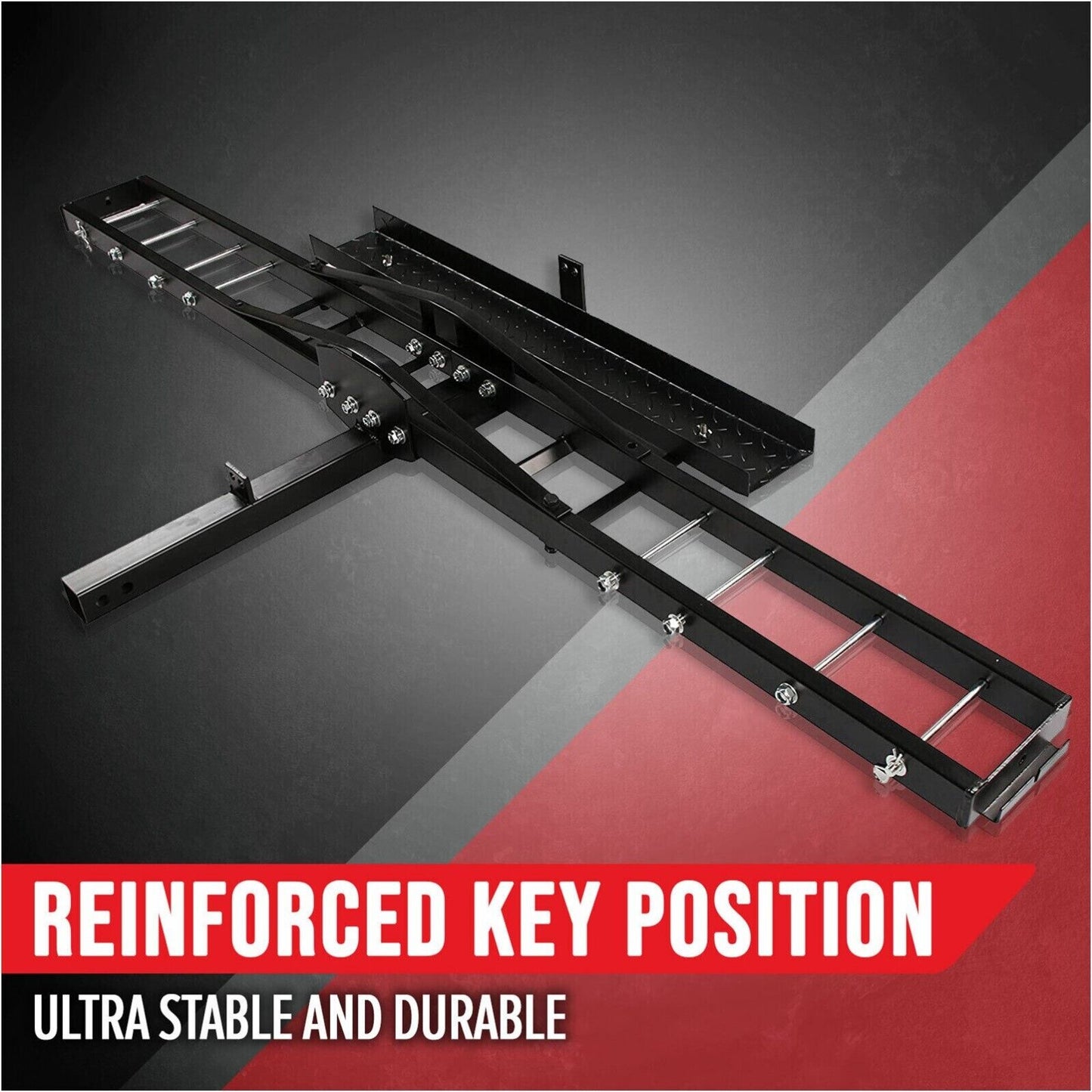 This convenient hitch-mounted motorcycle carrier eliminates the need to tow a bulky trailer. Heavy-duty steel construction, an impressive 227 KG weight capacity.