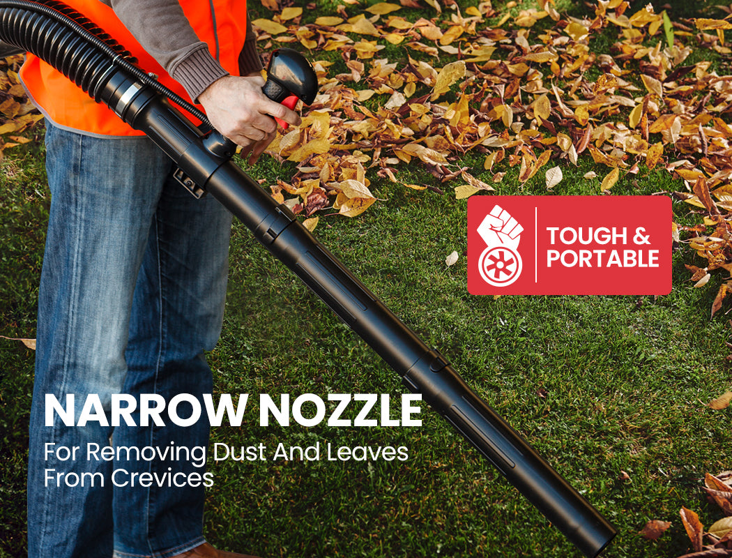 Thanks to the includedinterchangeable nozzles, you can easily clear out everywhere from driveways to garden beds, and tight crevasses. Asuper flexible air outletgives you optimal reach, and with a sensitive trigger, you can always apply just the right power to blow away even the biggest maintenance chores.
