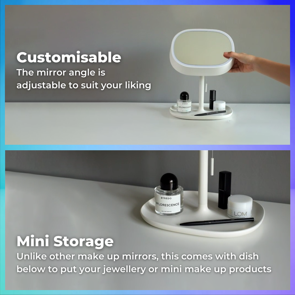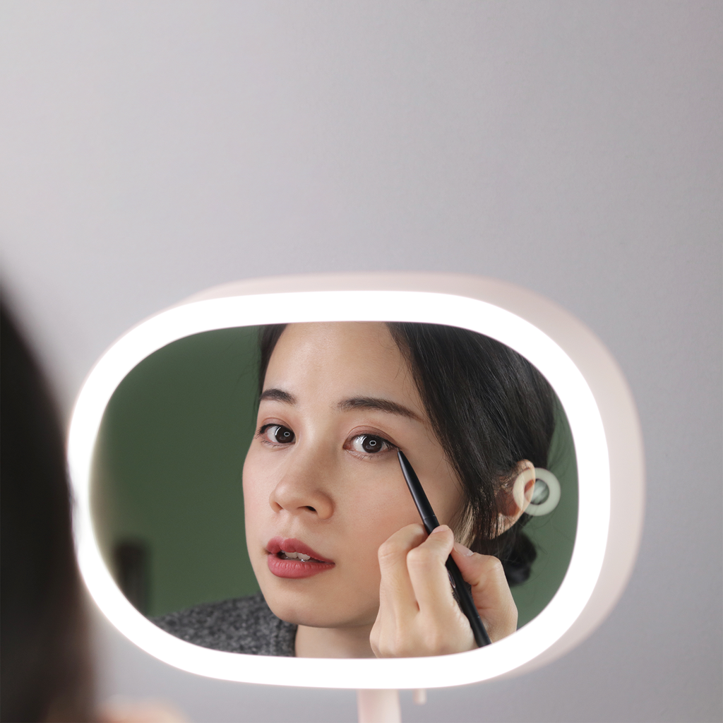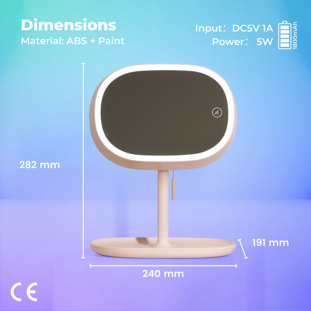 - A minimalist beauty mirror integrated with multi-functions such as standing a bedside table lamp and acting as a mirror for makeup.