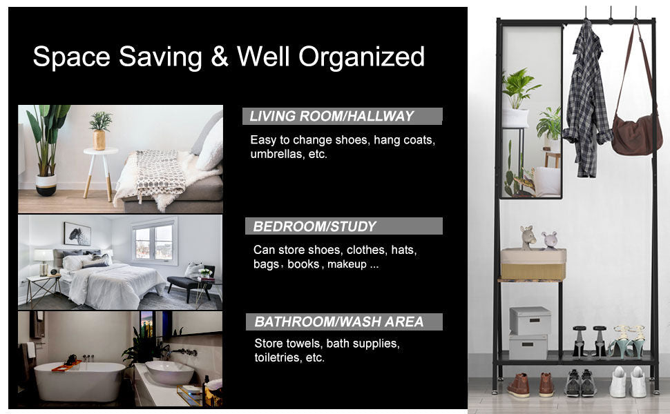 - 5 In 1 Multifuction Coat Rack with Shoe Storage: Coat Rack use classic and simple design.it could be use for most style room. coat rack,shoes shelf and full length mirror perfect combination; It is carefully crafted to fit all spaces, whether it's a entryway, hall, foyer, hallway, bedroom, mud room or office. The different using design make your room tidy and neat.