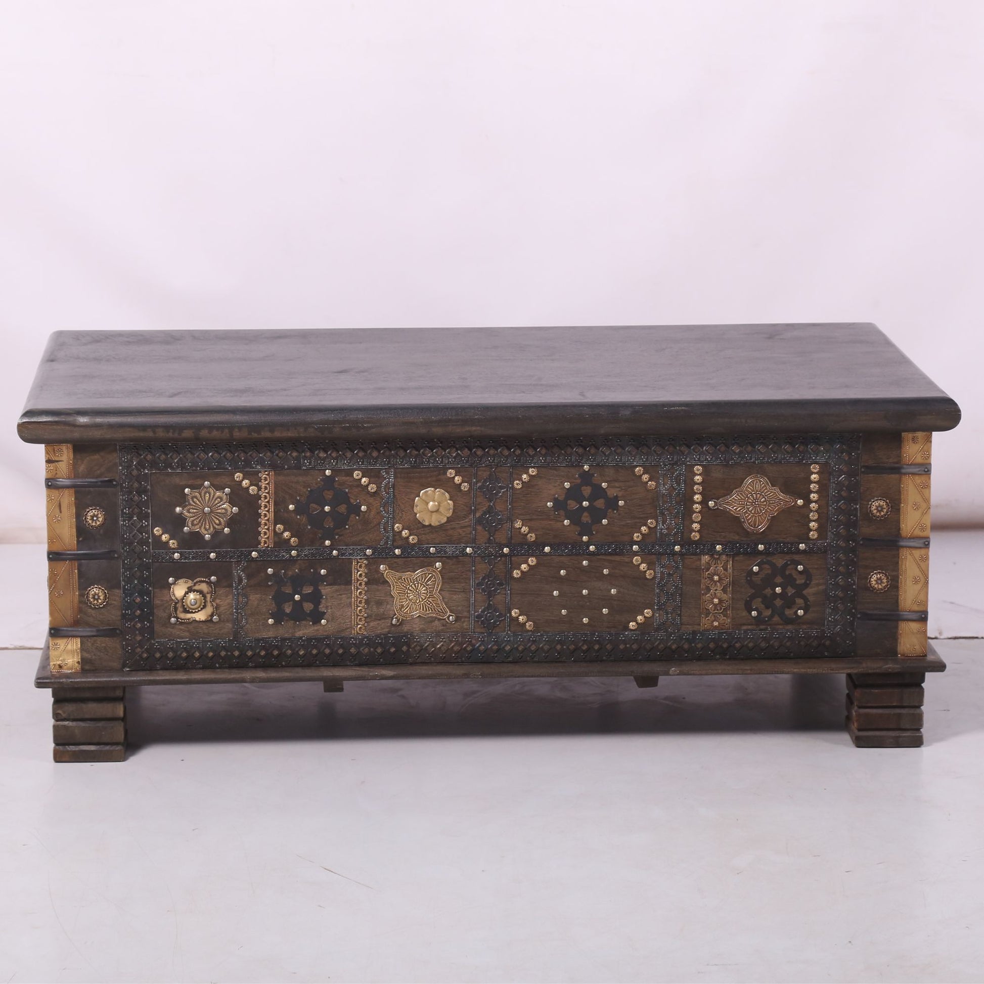 A visually appealing piece of furniture. This is a multi-functional coffee table that can also function as a storage trunk. Designed in the traditional style, it has a hidden storage area and a floating top that can be lifted to create a wide and higher surface. You can use it as a table to keep beverage cups, devices, laptops, or even a board game. The classic hand-crafted brass work on the table skirting gives it a beautiful look. The storage coffee table in dark walnut colour is made of sustainably harvested solid Mango wood that has been embellished with metal work. These materials provide it with a strong build and a robust structure. Its elegant look works well both in the traditional and contemporary interiors of the room. The hand-crafted detailing has slight variations, making each piece unique. The fully assembled storage trunk cum coffee table comes with a one-year warranty.