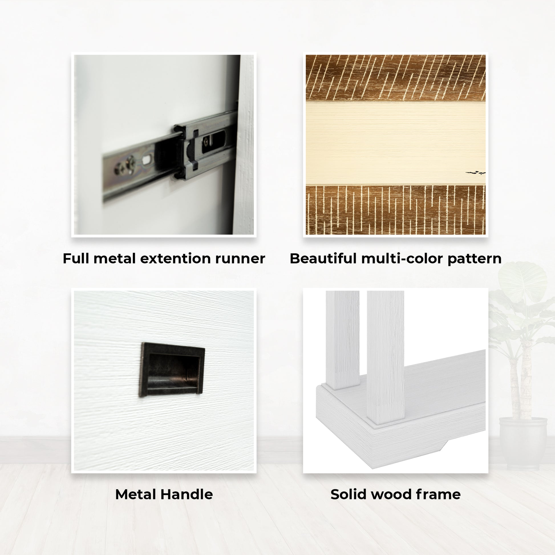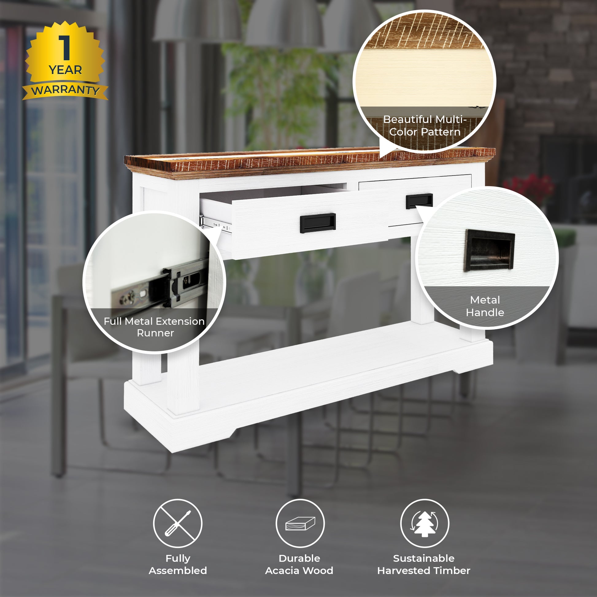 The console table is a versatile and attractive piece of furniture. It is a table with plenty of storage space, having 2 drawers. The drawers have a solid base with metal extension runners that ensure best performance for a long time.The table is made of sustainably harvested solid acacia timber. This particular wood is known for its strength, long life, and resistance to moisture and humidity. Designed in a Modern-Rustic style in a multi-colour finish, this charming console table offers a beautiful look to your living room that instantly draws attention. The fully assembled table comes with a one-year warranty.