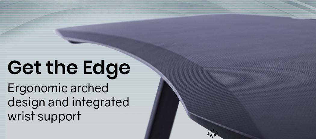 The desktop features an arched design that is tapered on an angle for optimal comfort during marathon sessions.