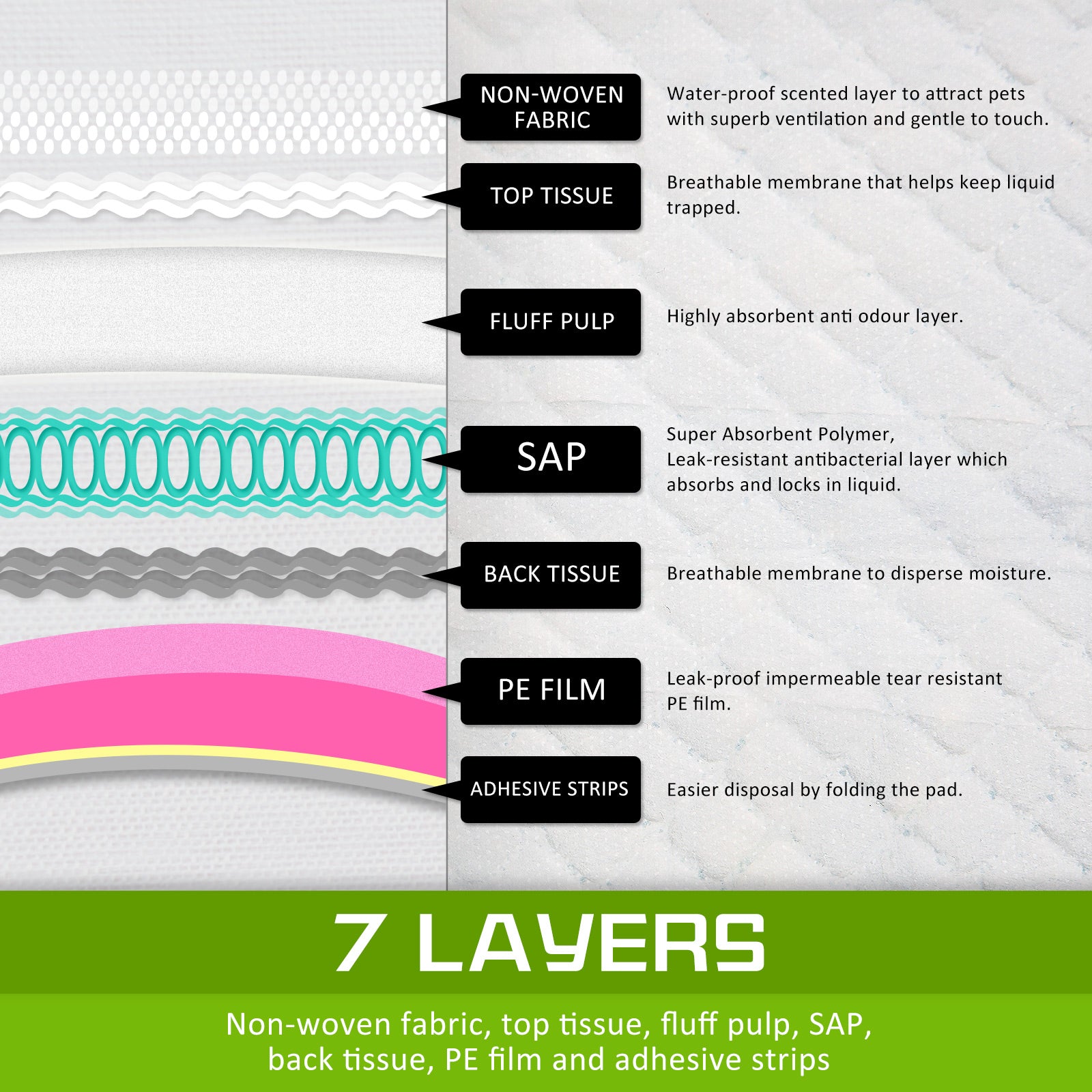 - 7 layers of protection: Non-woven fabric, Top tissue, Fluff pulp, SAP, Back tissue, PE film and adhesive strips