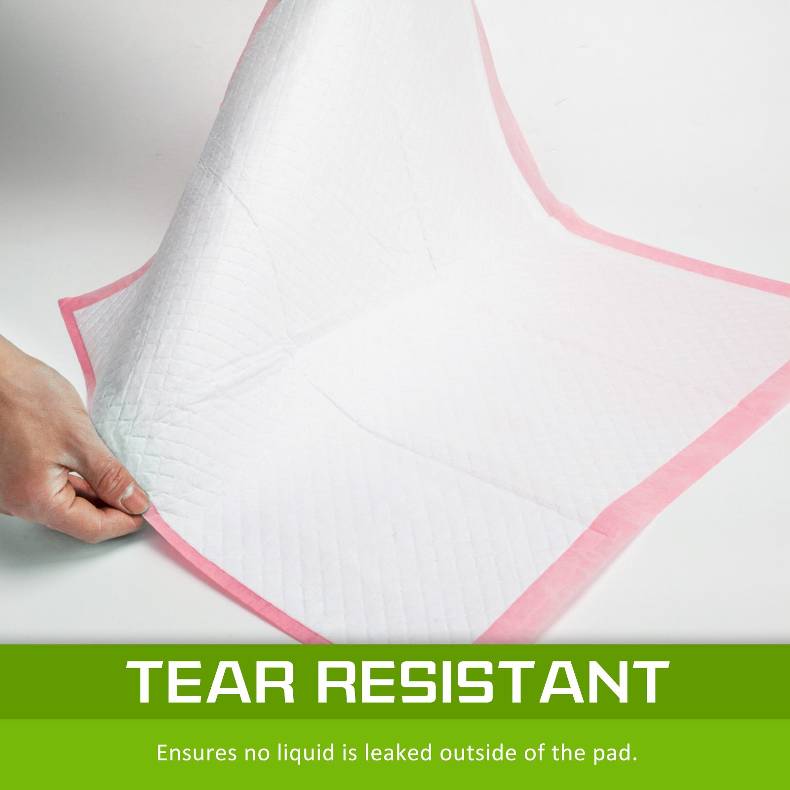 The pad is made of high-quality soft non-woven fabric with 7 layers of protection so it absorbs high quantity of liquid. We tested and it can hold up to 850ml of liquid without leaking. The pad is treated with antibacterial protection so you can have a peace of mind that your beloved pet is protected. Together with the super absorbent pad, the high-quality leak-proof and tear resistant plastic liner and borders ensure that no liquid is leaked outside of the pad. This is very important as you do not want to do extra cleaning as well as your dog to be confused as to where it should do their toilet necessities.