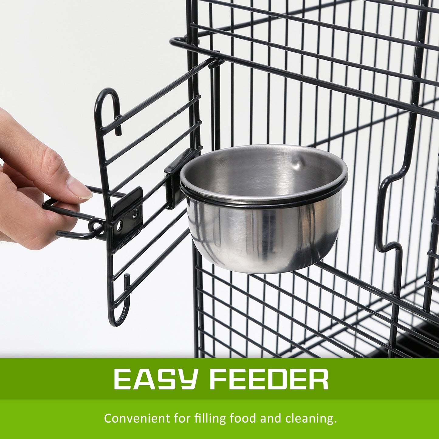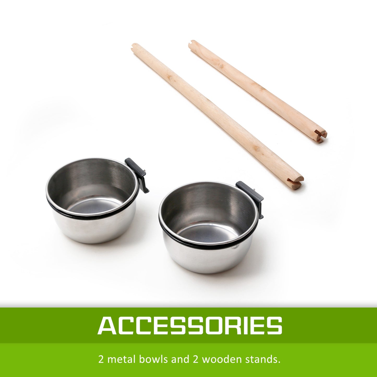 - Comes with 2 wooden perches and 2 stainless steel food/water bowls