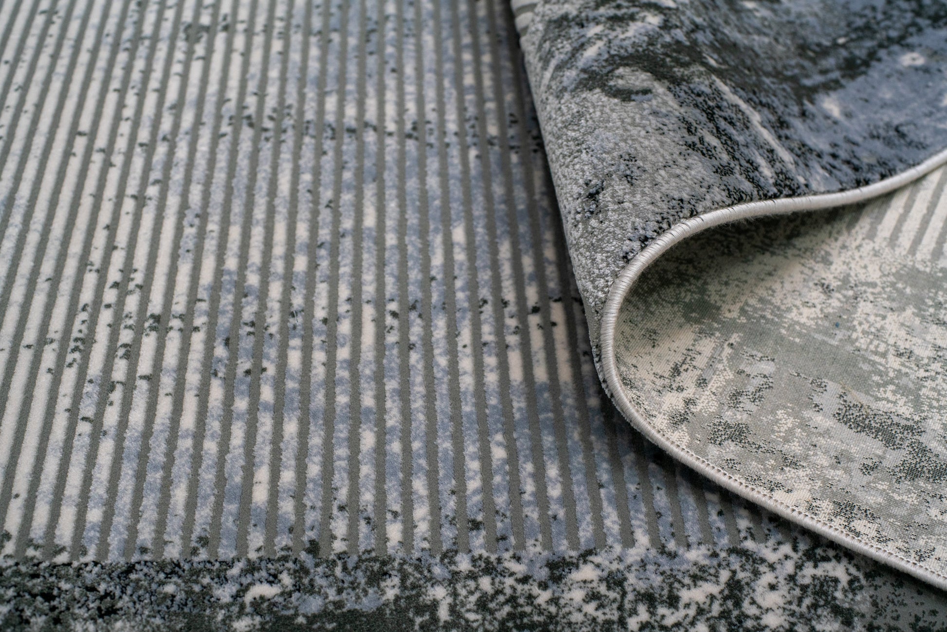 An elegant abstract style rug with a grayscale theme. The predominantly white central region is teased by spatters of greys, and this spacious area is bordered by faint strokes of black that define a soft fading edge, preserving a feeling of elegance with the boldly contrasting colours. This design is a tasteful touch to a modern or classic home environment.