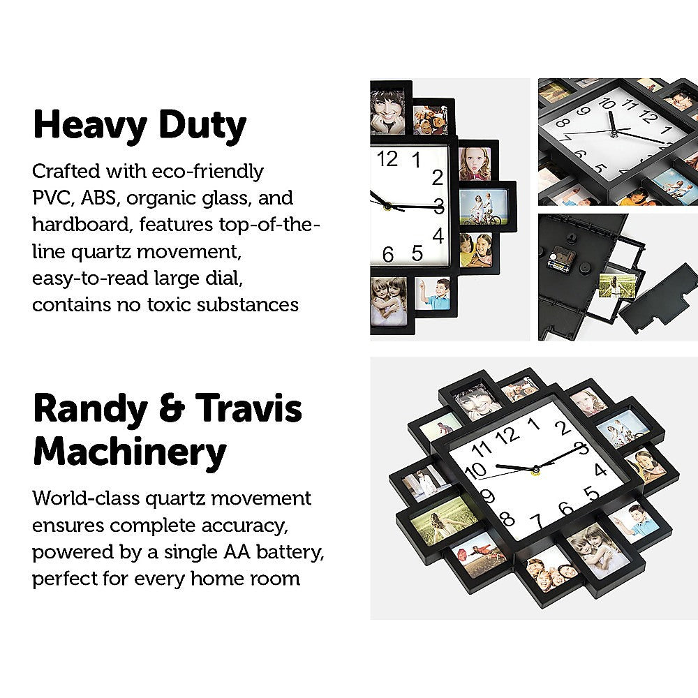 Keep your family and friends in mind during the day with this gorgeous photo collage wall clock by Randy & Travis Machinery. Displaying 12 photos in an abstract sunburst design with the timepiece at the centre, this clock makes for a stunning display in any room. With both the photos and clock enclosed in black frames, this clock makes a dramatic statement on your wall. It's perfect for living rooms, rumpus rooms, bedrooms, or offices and makes a perfect gift for housewarmings, birthdays, holidays, weddings, graduations, and the birth of a new child.