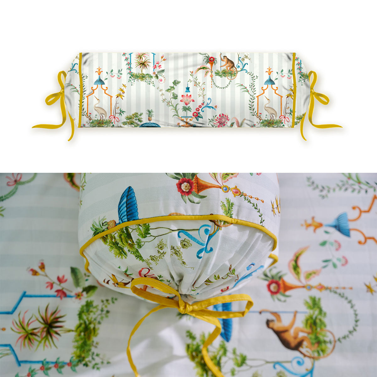The Singerie White Neck Roll Cushion 22x70 cm by PIP Studio has a cheerful design with decorative scenes featuring birds, monkeys, and a heron printed in white, teal, green, red, yellow, pink, orange, brown, and black colour tones. A tonal stripe makes up the background of these scenes. This print was inspired by the singerie art genre that was popular in the South Netherlands during the Rococo. The decorative cushion has brightly coloured cord piping and a unique tie closure. The cushion is made of 100% percale cotton, 200 TC. Percale is a fine woven cotton of high quality. The cushion is 22 x 70 cm. The cushion can be washed at temperatures up to 60 degrees, is suitable for tumble drying, and can be ironed.