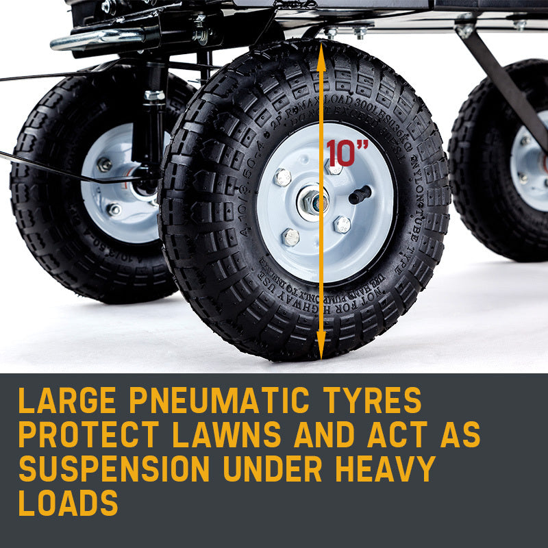 The Poly Pull Dump Cart features ultra-durable 10" pneumatic tyres that act to protect fragile lawns and roll over all kinds of terrain with ease. Maneuvering the cart is made even easier thanks to the pivoting front steering that produces a tight and uniform turning circle. It's operated with a soft-grip 80 cm steel handle attached to its tough powder coated steel frame. This versatile cart is also a handy piece of equipment for all kinds of outings and events. Use it for carting around sporting equipment at the kids sports game or moving all the food, drink and accessories for your next picnic.
