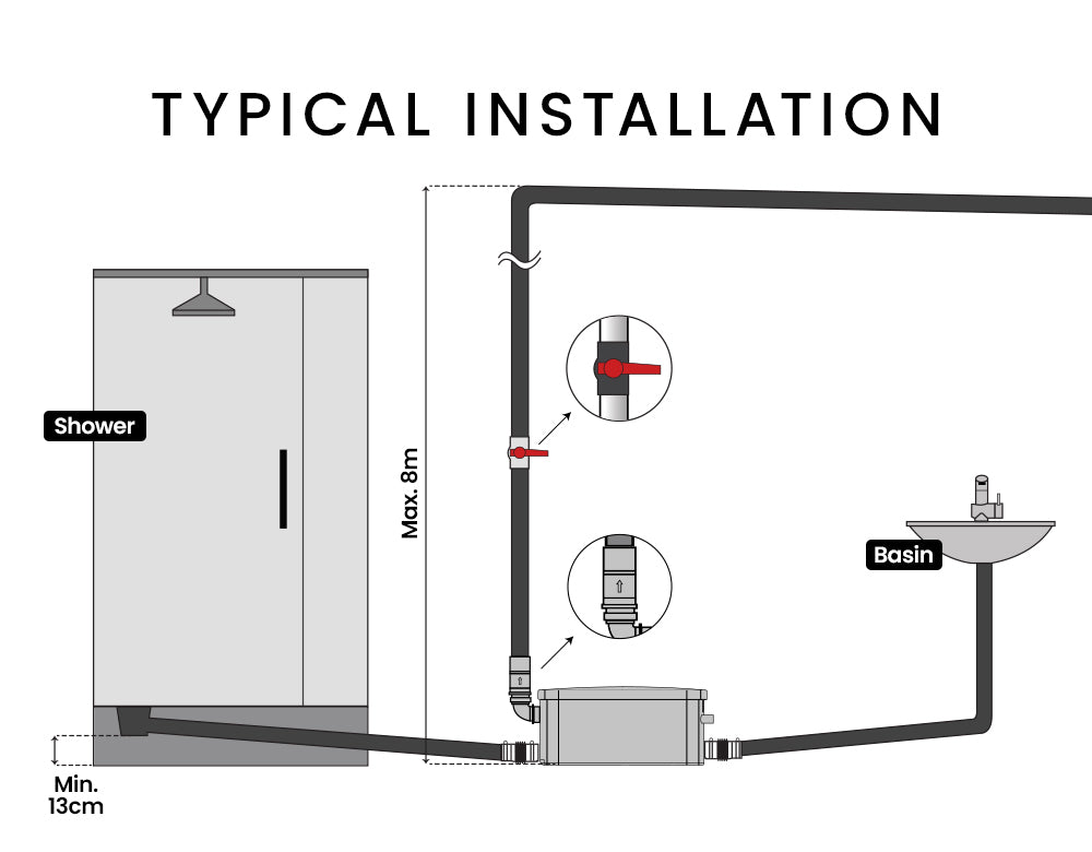 The Shower Plus runs quietly thanks to the smooth 200W copper wound motor and rubber feet. It is capable of pumping up to eight metres vertically and 80 metres horizontally.