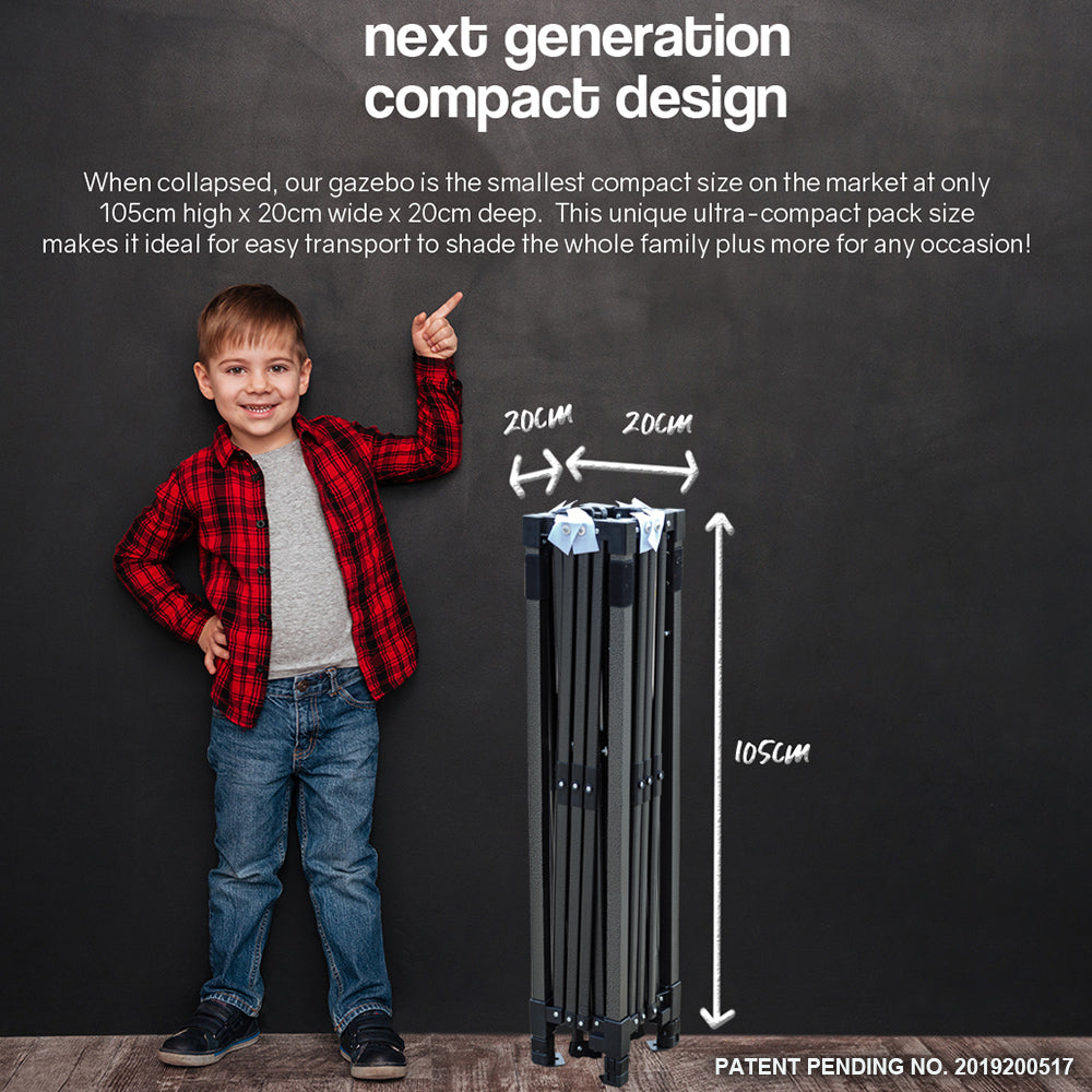 The Red Track Portable 3x3m Gazebos are designed with convenience, stability, and durability in mind. Featuring a patented design, this Red Track Gazebo folds down to be the most compact 3x3m model on the market, for convenient transportation and storage.