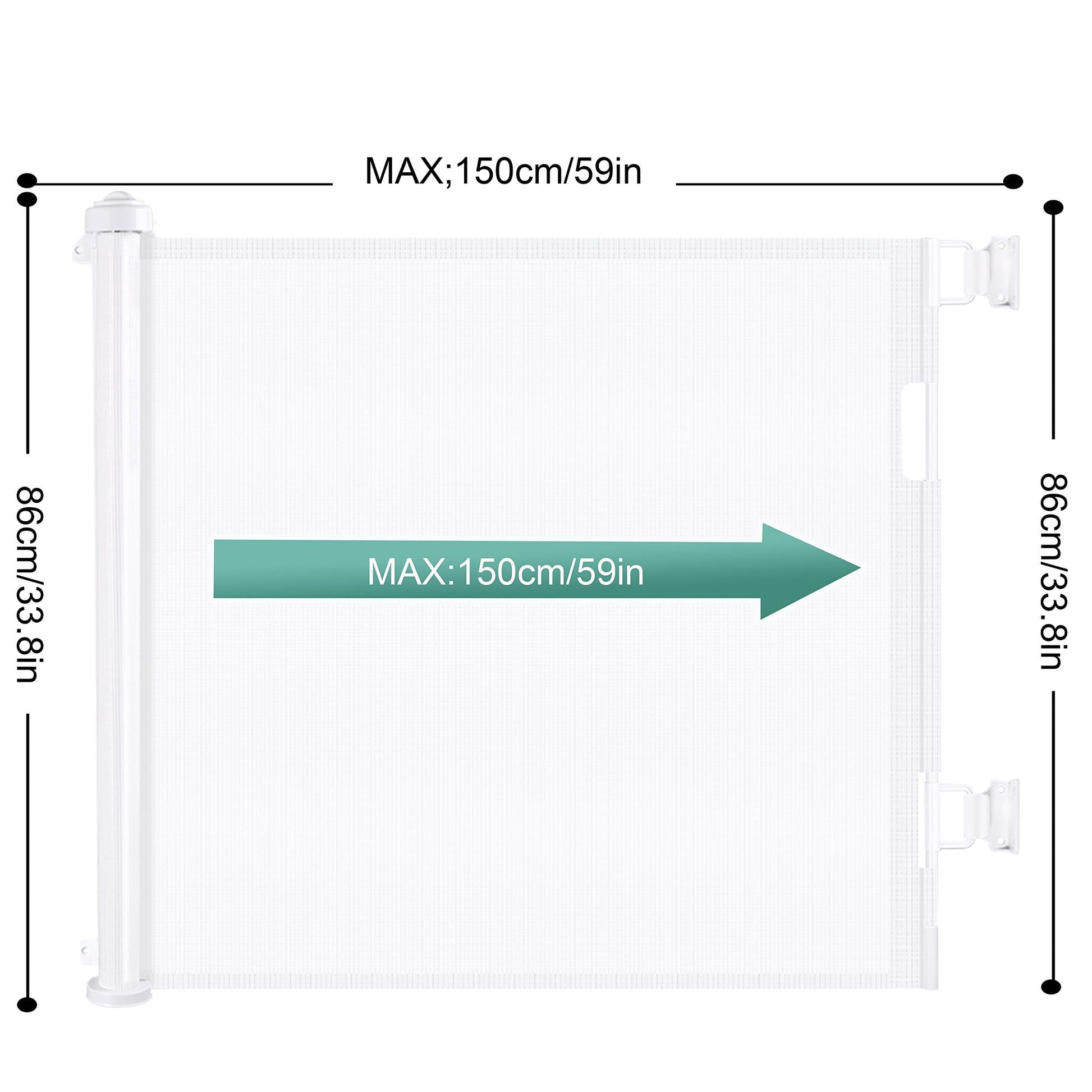 This retractable baby gates can be extended up to 150cm wide and 86cm tall. Mesh can be completely retracted away when not in use.