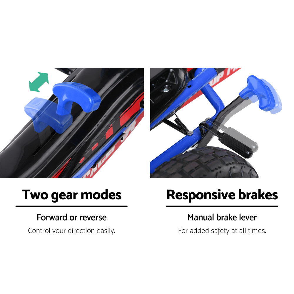 Made of a very sturdy steel frame with oxygen-welded joints for extra stability and durability, the Kids Go Kart has a large and adjustable seat with a high back rest for maximum comfort. Pedal power is assisted by a forward and reverse control and a sporty and highly responsive 3-point steering wheel. The large pneumatic rubber tyres provide good grip and traction as well as good shock absorption for a smooth ride. And for safety, the bike chain is fully covered to prevent any injury whilst the manual brake is super effective too. Not least, the striking colours and finishing simply look awesome.