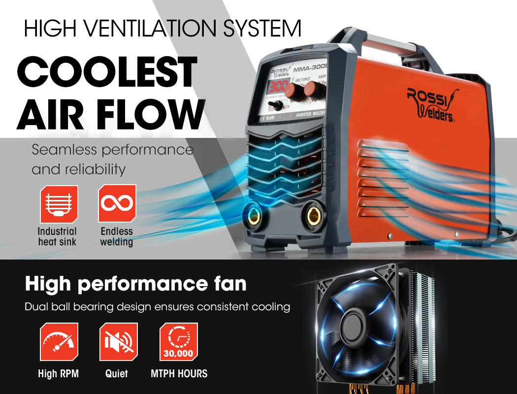 With an efficient pure copper toroidal transformer and output current adjustable between 20A and 300A, you can achieve a quality smooth weld finish whether it be with steel, stainless steel or cast iron. The Rossi is well suited for outdoor and even windy conditions, and is forgiving when working on dirty or rusty metals. This awesome unit is capable of running a wide range of electrodes, and an advanced cooling system with large fan ensure dissipated heat effectively easily for superior performance and durability.