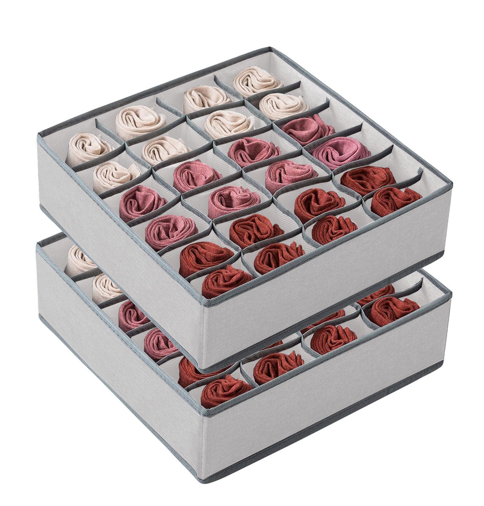 Set of 2 Fabric Drawer Organizer Divider Storage Boxes for Storing Socks, Underwear, Ties, Scarves (Grey)