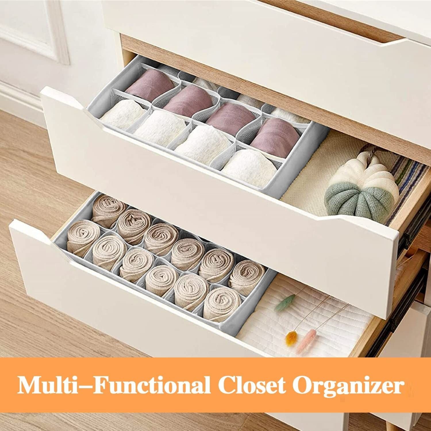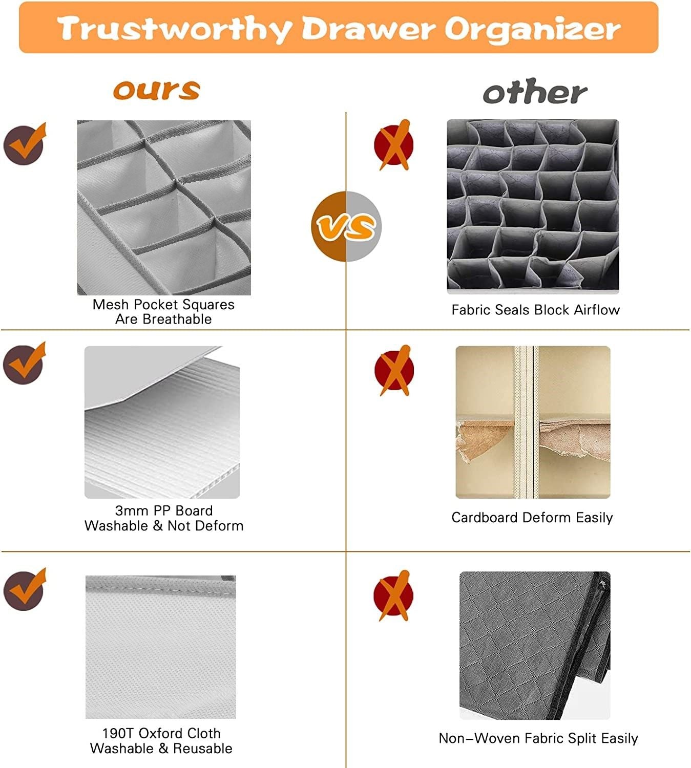 - 2 PACK: It comes with 2 pack of closet dividers, you can use one as wardrobe organizer for storing socks, underwear, bras, handkerchiefs and thin scarves, and the other one for dresser drawers to store jewellery, nail polish, lipstick,other bits and bobs etc. Make sure your drawer is no longer chaotic, and become tidier and neater.