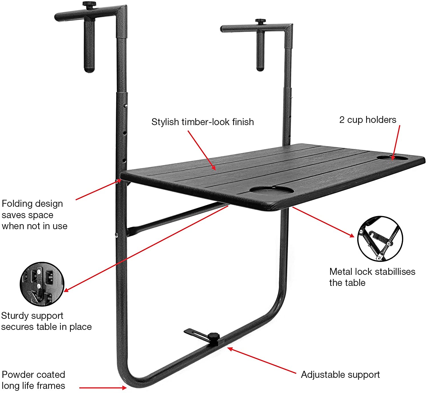 This table is ideal for balcony living. The stylish wood grain finish design sits over top of the railing to be used as a table or a shelf.