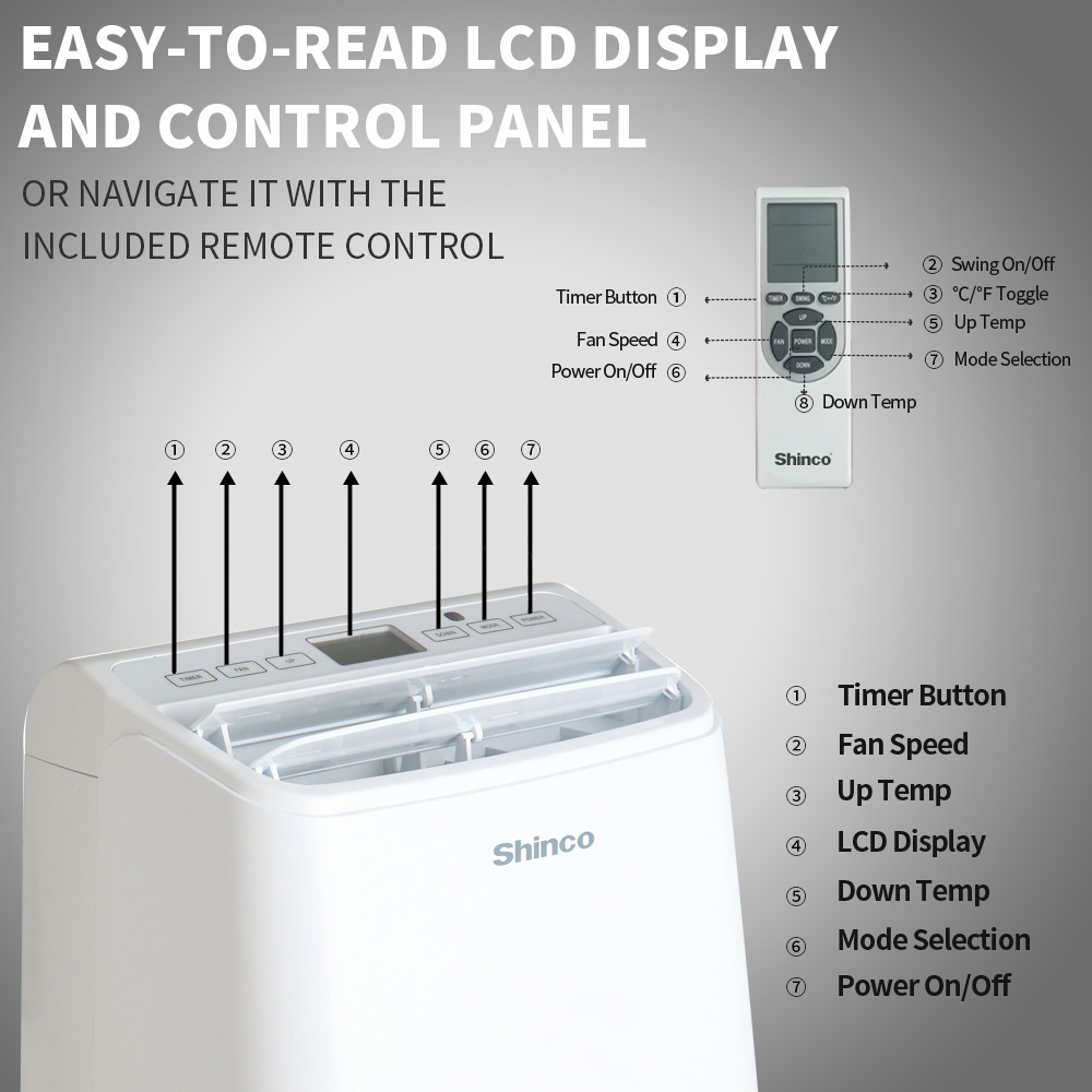 ❄【Easy to Operate】Shinco SPS-12C portable A/C unit is fully equipped with a smart LCD panel, full-function remote control to change the time, temperature and mode easily. Four casters and built-in grips can help you move the air conditioner portable from room to room effortlessly.