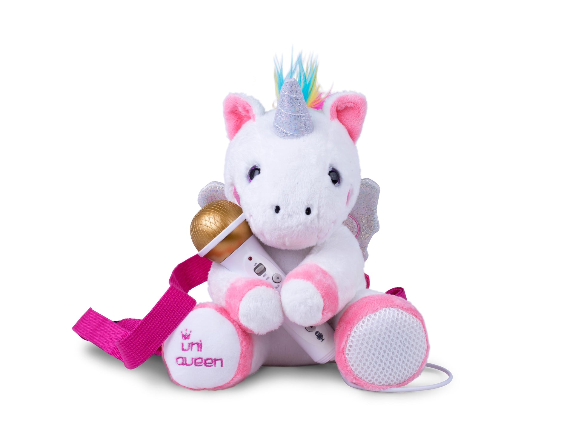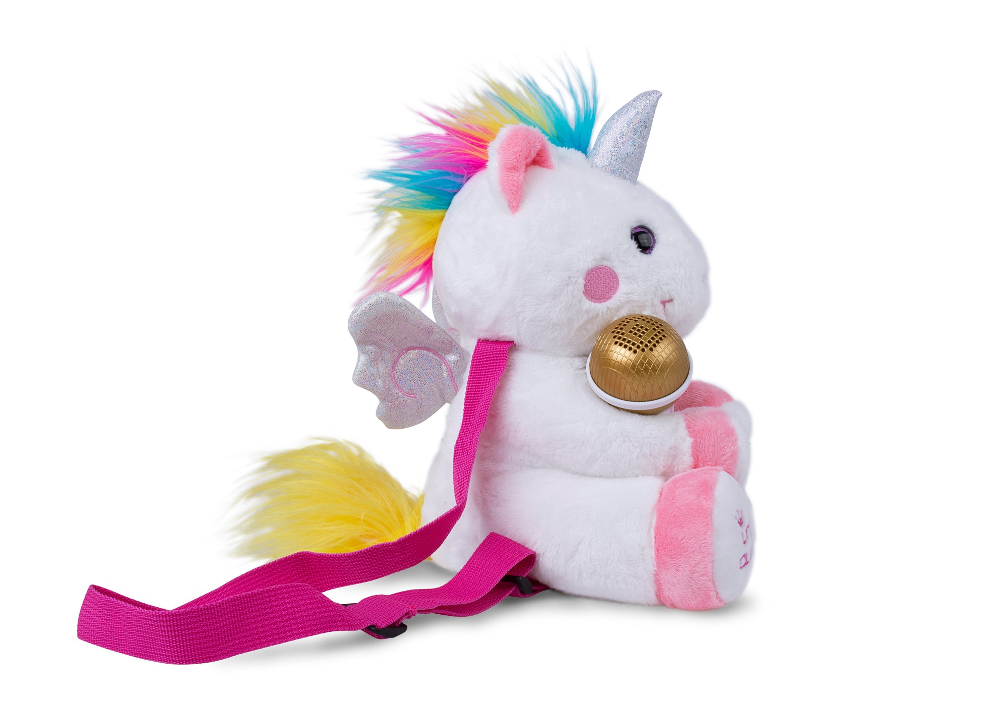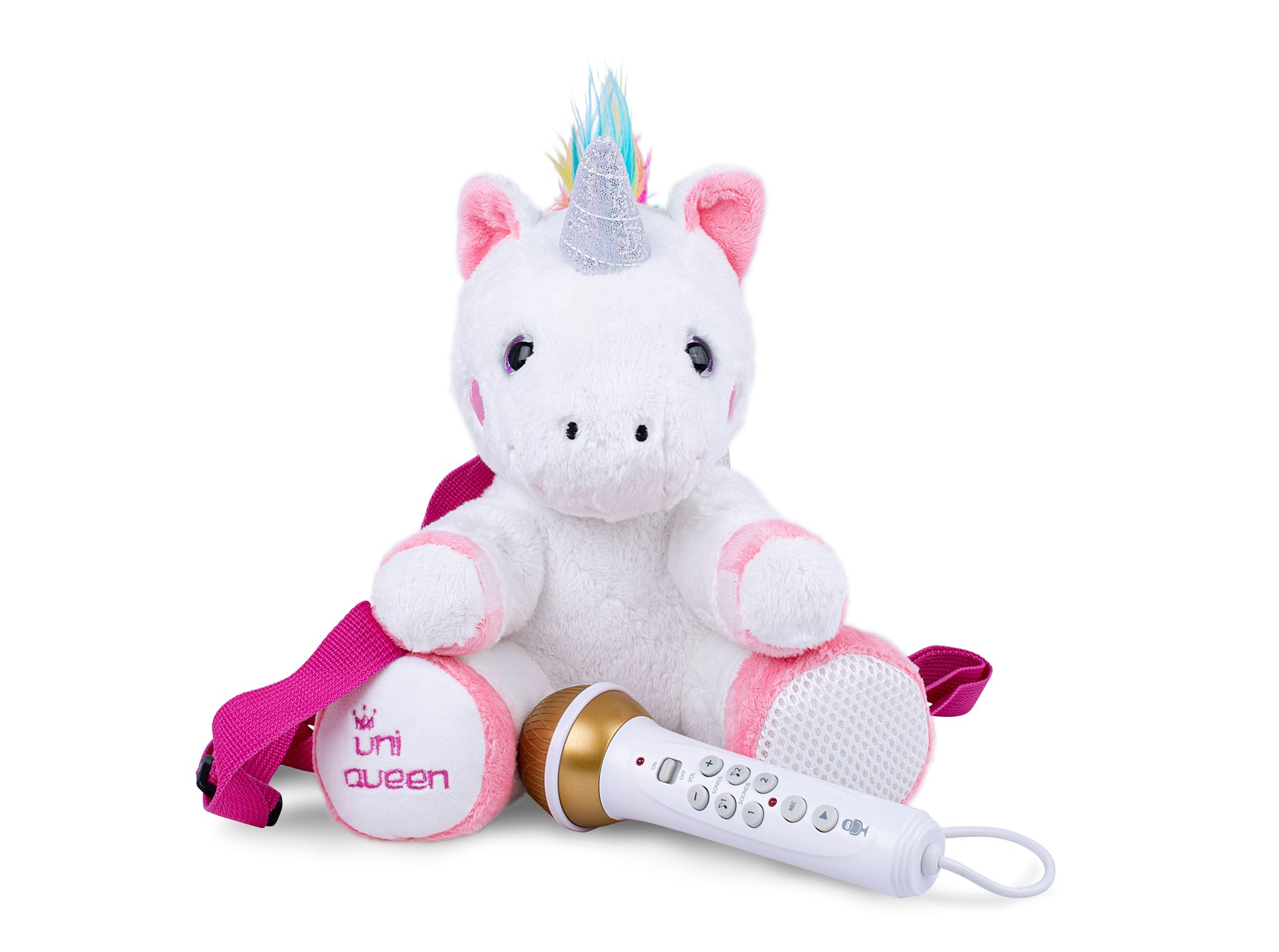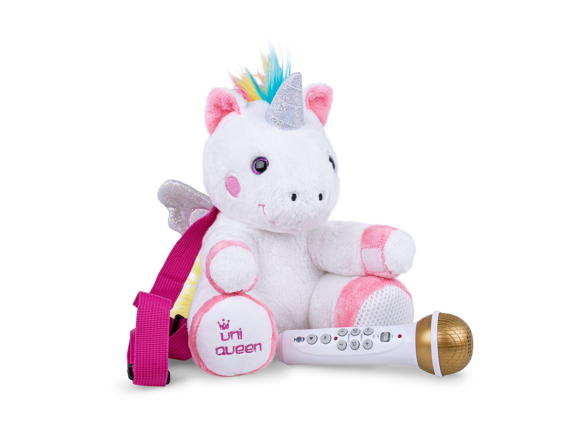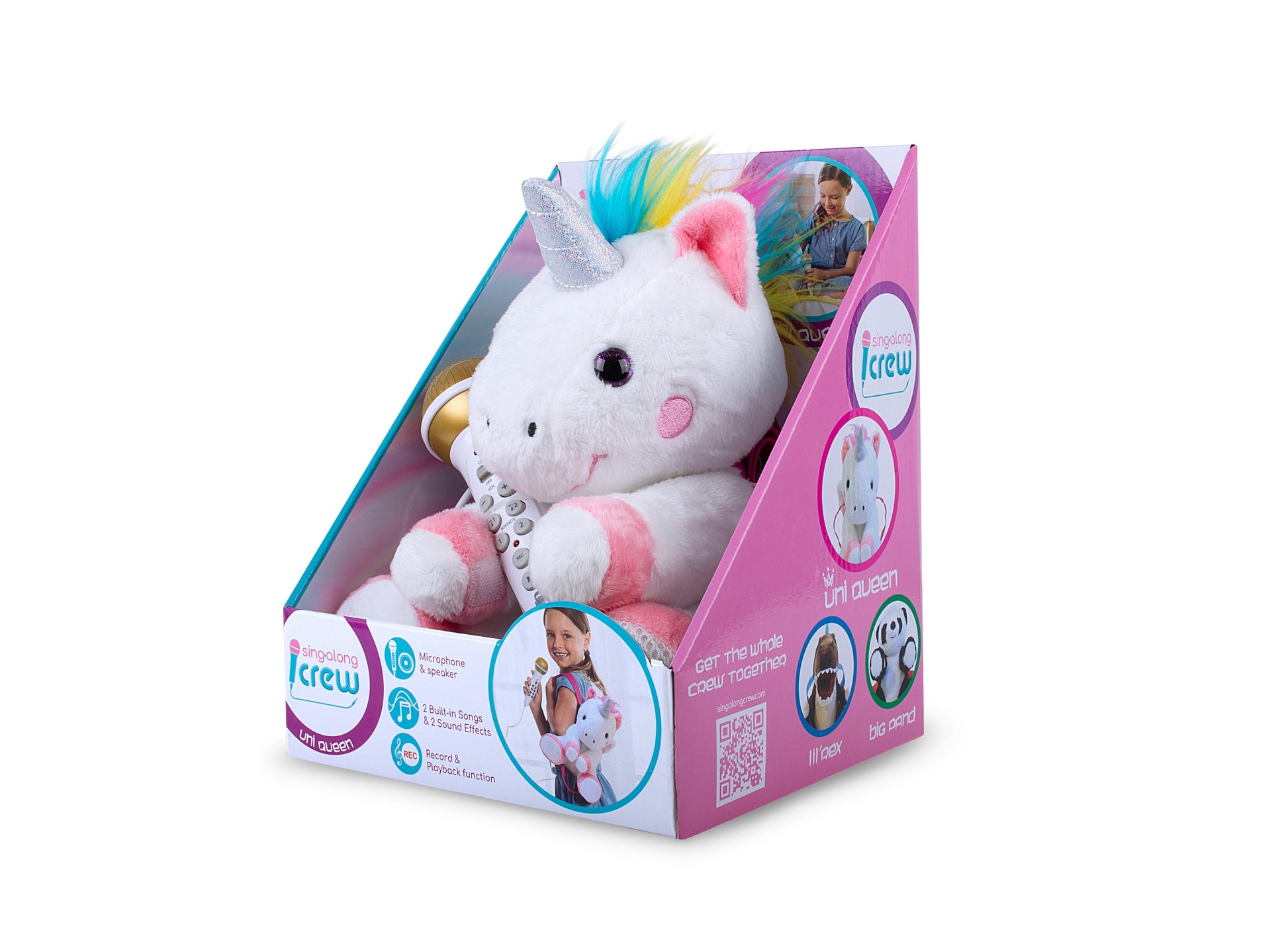 Meet the Sing-along Crew! They’re your new singing buddies! Lil' Rex, Big Pand, and Uni-Queen want to share their love for music with the world. Lil' Rex is the loud and confident T-Rex who is a goofball at heart. Uni-Queen is a creative, natural-born leader. Big Pand is big and strong with an even bigger heart. Get singing with them with the built-in speaker. Sing along to the 2 preloaded songs and add some fun with the 2 sound effects The Sing-along crew comes ready to go anywhere with their backpack straps and your cuddly friend will hold the mic with the secure mic holder. Get the crew together and let the fun begin!