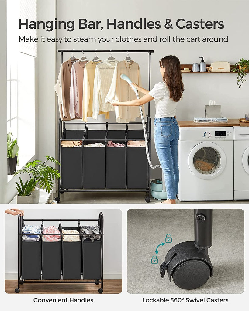 - The SONGMICS 4-bag Laundry Sorter with hanging bar will greatly simplify your laundry day. It combines the design of laundry sorter and garment rack, enabling you organize your laundry beforehand and hold them after washing, comes more practical and functional.