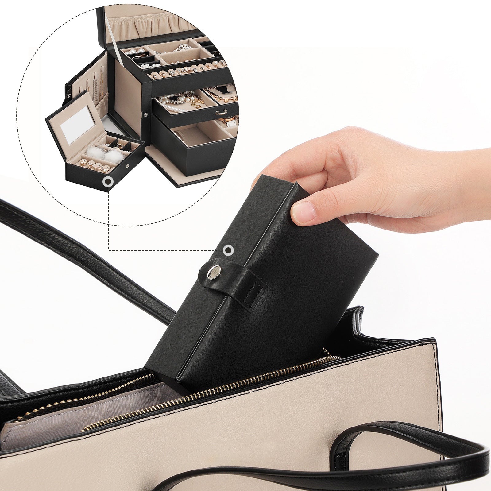 Protects Your Jewels:Designed with many compartments for different products and shapes, the jewellery case keeps your bracelets, rings, earrings, and necklaces well-stored. The soft velvet lining safely protects your delicate jewellery against scratches and other damage.