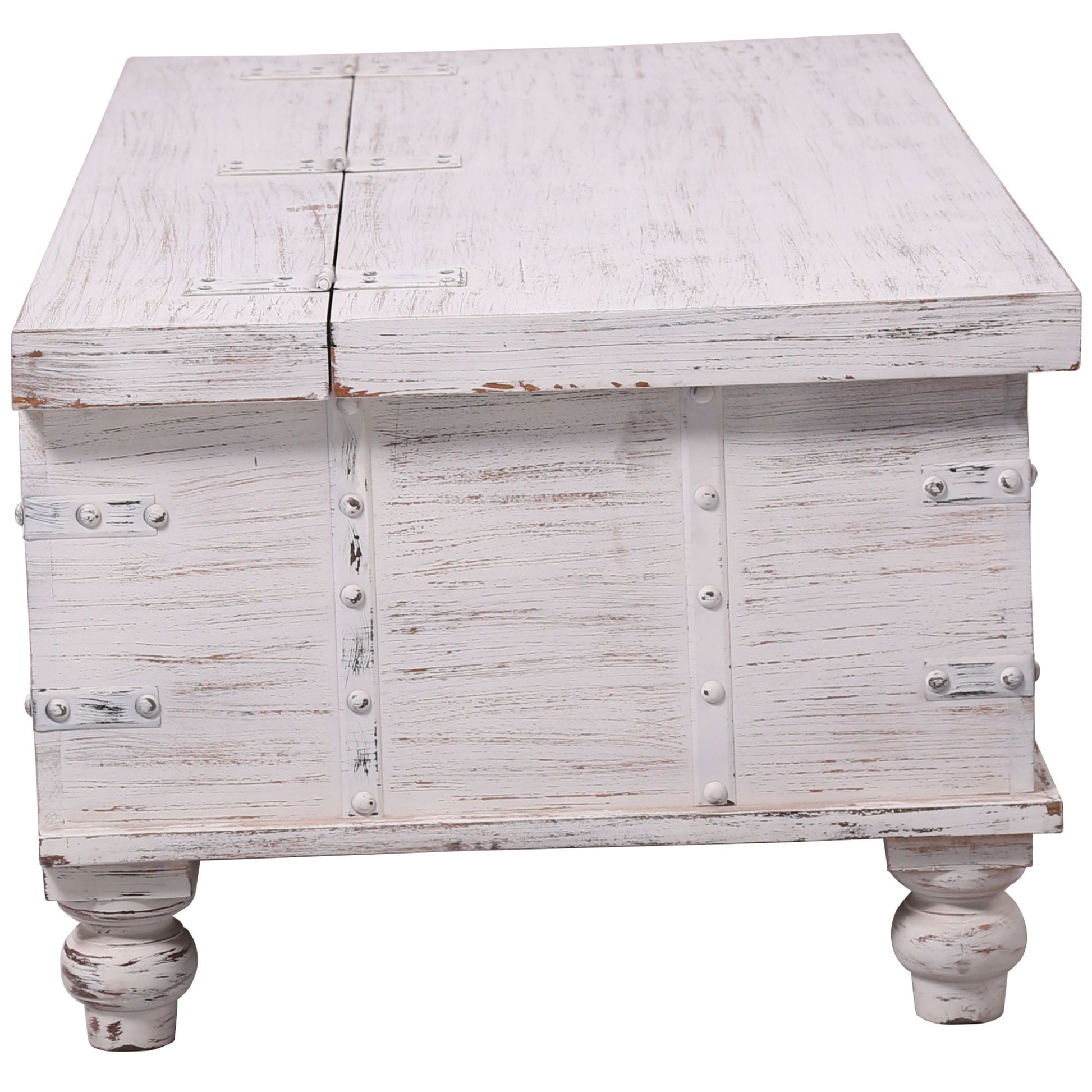 This is a multipurpose piece of furniture that can be used as a storage trunk and also as a coffee table. Designed in the traditional style, it has a storage area with a hinged lid and a spade style front latch. It showcases a vintage look with a white distressed finish on the outside and a walnut finish on the inside. You may decorate it in your living area and use it as a table to keep beverage cups, devices, laptops, or even a board game.The storage coffee table is made of sustainably harvested solid Mango wood with metal work on it. The wood and metalwork provide it with a robust structure and good looks. Short, scalloped legs provide the storage chest with strong support. The fully assembled storage trunk cum coffee table comes with a one-year warranty.