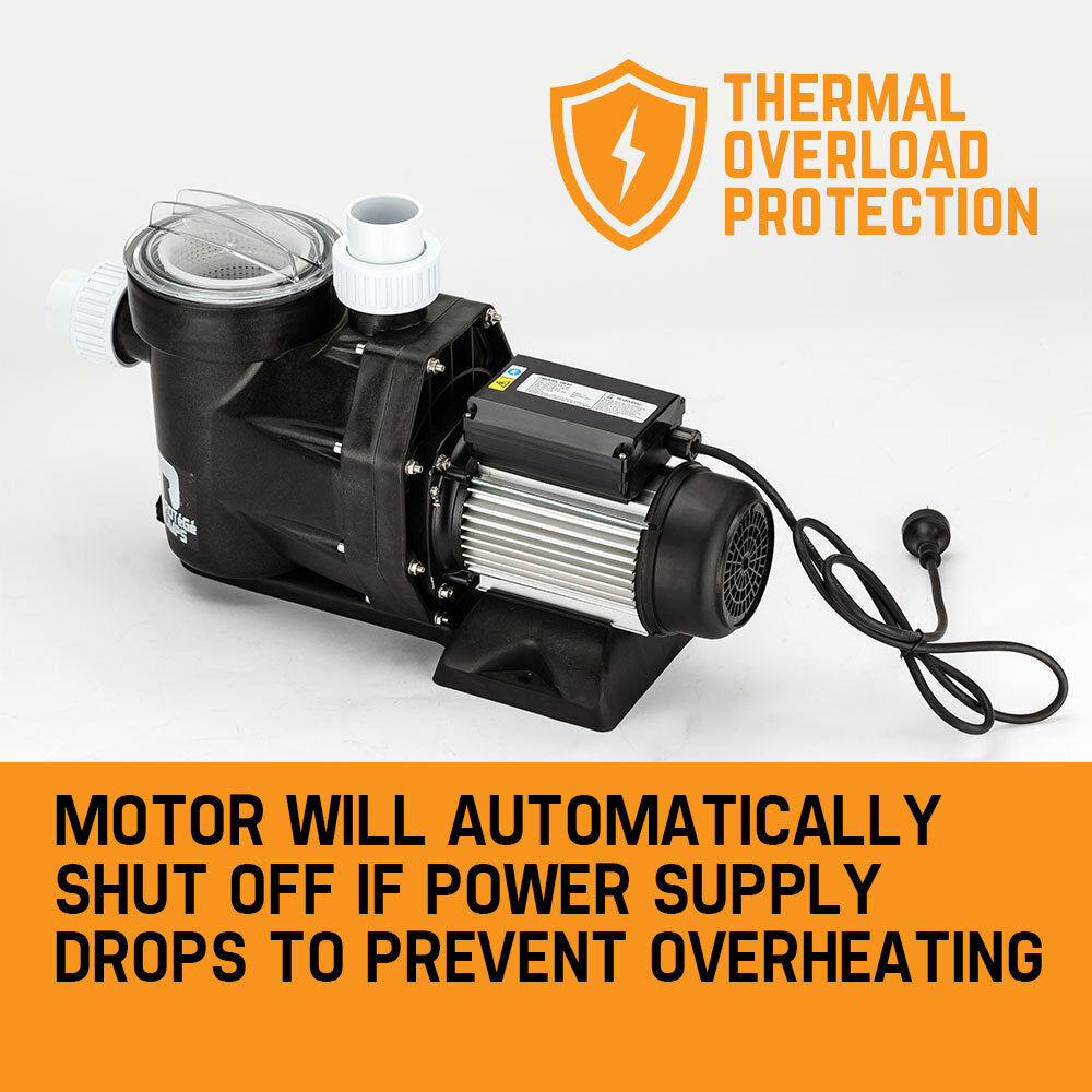 The Protege 550W Electric Swimming Pool Pump takes care of cleaning, filtration and chlorine/salt distribution. It features a revolutionised removable strainer basket with a built-in thermal overload protection - as the water circulates and passes through the filter, it leaves your pool squeaky clean, free from leaves, hair strands, debris and other impurities.