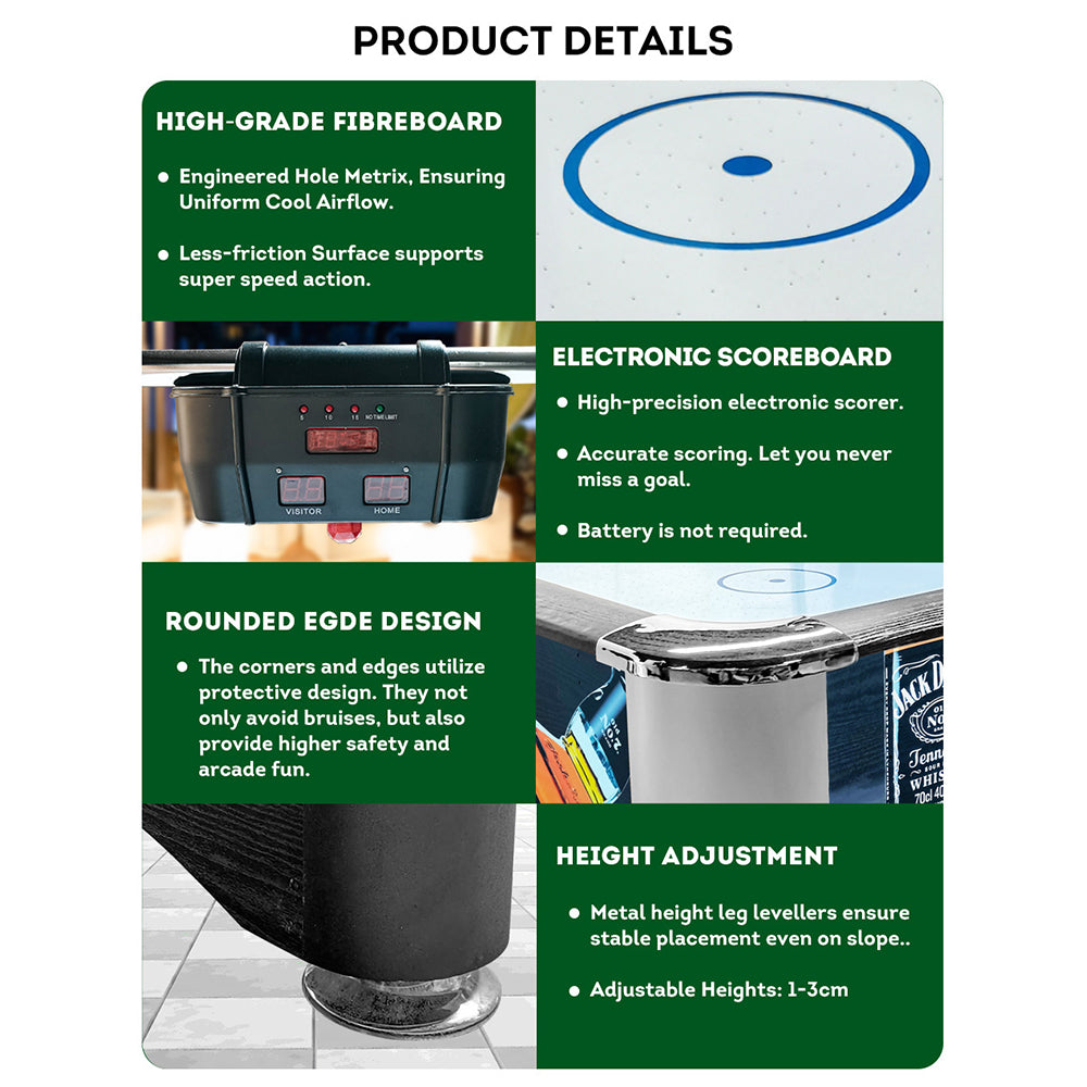 This air hockey table has improved features and dramatic printed graphics. It also comes with an overhead electric scoring bridge, dual-motor blower, leg levellers, protective rounded corners etc. It is believed to provide a lot of great experiences for your family and friends!