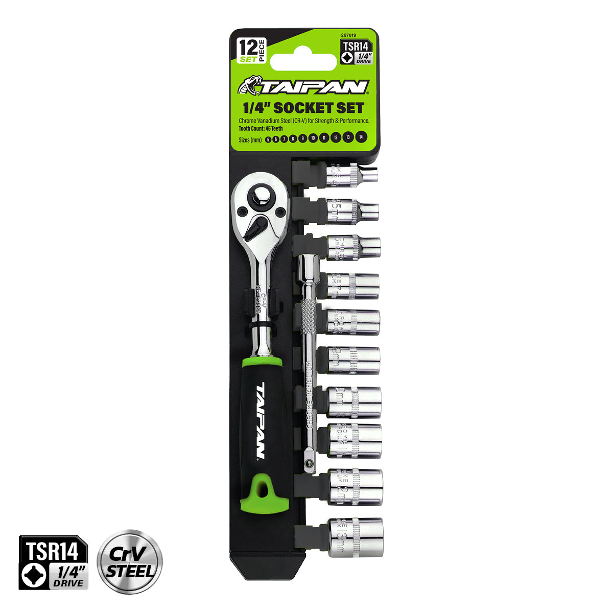Taipan An impressive 12 piece 1/4\" ratchet and socket set containing an assortment of socket sizes for various lines of work. Featuring premium quality chrome vanadium steel parts, this exceptional tool set has an organiser to keep ratchet, extension and sockets organised when stored. A functional and convenient set for any toolbox.