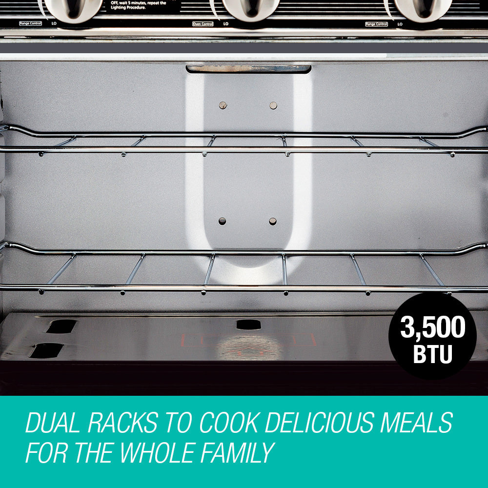 Made with quality stainless steel, you can be confident of the unit's durability. Featuring 5,300 BTU twin stove burners with non-stick enamel surface, a 3500 BTU oven with dual racks, removable oven thermometer and a bonus roasting tray, the Thermomate Outdoor Camping Oven has thoughtfully included everything you need to create a home cooked meal outdoors. The folding lid and arms will shelter heat from wind while cooking. Cleverly designed, it is powerful yet compact, weighing only 15kg, ensuring easy transportation and storage.