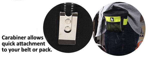You can attach your Dog's leash, secure your water bottle (included) and store your keys, mobile phone and waste bags in the two waterproof zipper pockets.
