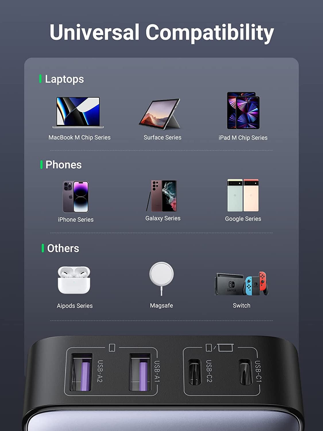 Advanced GaN & SiC chips provide improved heat dissipation. Ugreen's Thermal Guard System takes temperature readings every 0.5 seconds protecting devices from overheating.