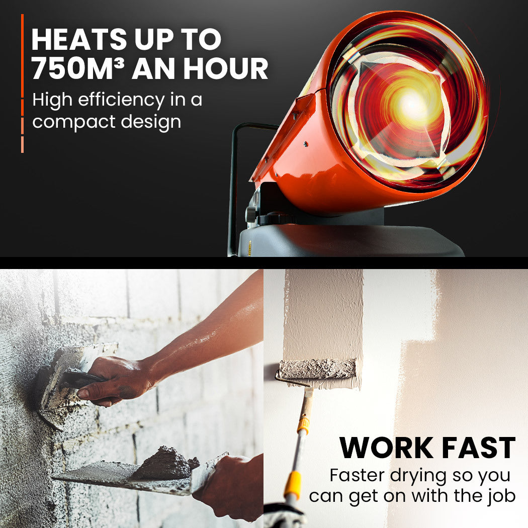 The 30KW Unimac UMDHT-68 Industrial Diesel Space Heater provides an instant, effective and dependable heat source for a wide range of commercial, agricultural and industrial uses. This Fan Heater boasts a massive 750m³ per hour heat output and electric start ignition. With its portable compact design it is perfect for positioning where needed to keep staff productive in well ventilated carpentry and mechanics and workshops, warehouses, greenhouses. It’s also ideal for drying paint and plaster quickly, so you can get on with the job at hand.