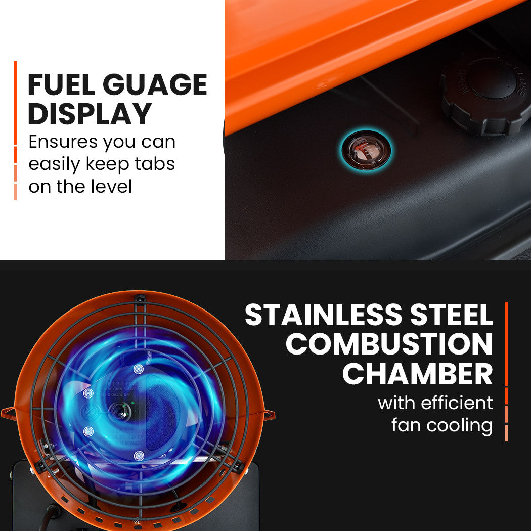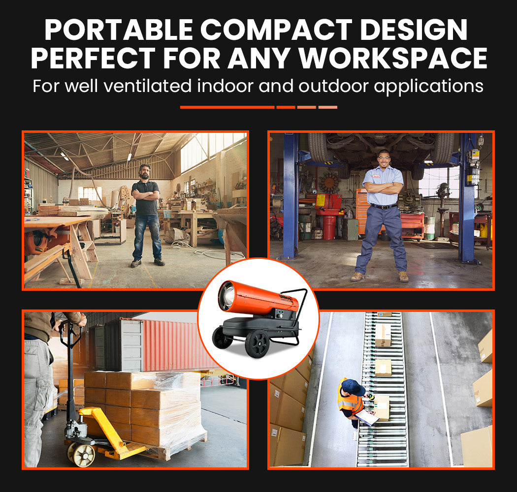 Importantly, this Portable Blow Heater is an exceedingly safe unit to have functioning in busy environments. It has built-in features which protect against overheating, flame-outs and electrical power breakdowns. Moreover, it operates on both Diesel and Kerosene fuel for greater versatility.