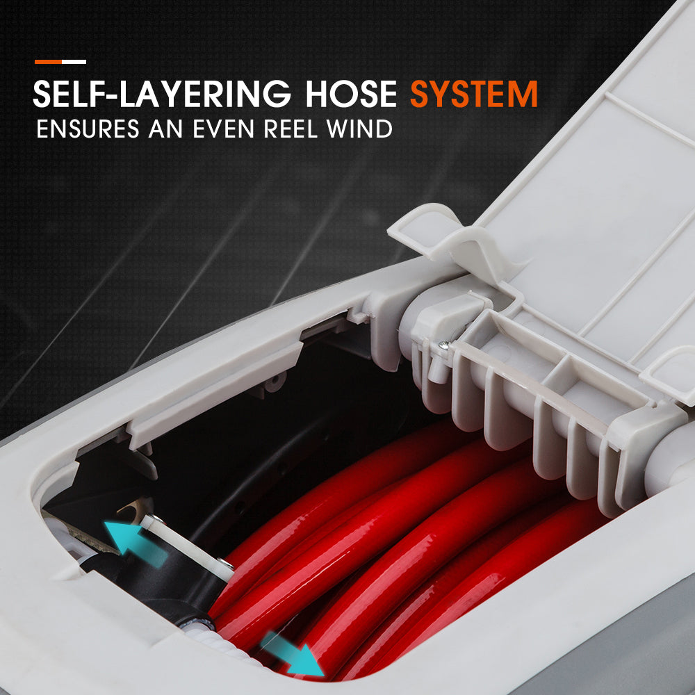 The Unimac air hose reel is wall mountable with an encompassing 180° swivel. Secured with a quick disconnect hinge rod, the unit can be easily removed from the wall bracket by slotting out the rod should you wish to relocate it to other areas around your work space. The 30m model also comes with a handy rear leader hose holster that helps you maintain an even safer and tidier connection between the compressor and reel. Other convenient features include the internal access hatch situated at the top of the casing, and the swivel carry handle.