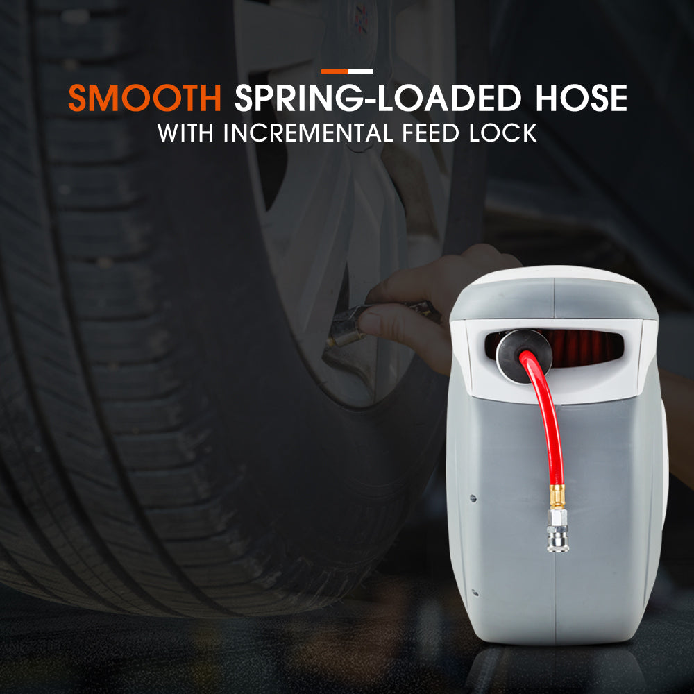Introducing the NEW Unimac 30m Air Hose Wall Mounted Reel. This commercial grade air hose reel is the largest in Unimac's latest range, boasting a huge 30 metre hose that offers you the freedom to move all over your workshop from a single connection point. The hose is made up of ultra-durable PVC with quality stainless steel 1/4 NPT quick connect fittings. The 2 metre leader hose connects onto the side of the unit and provides ample length to reach a compressor situated close by. The smooth spring-loaded hose has a convenient incremental feed lock that ensures your tools stay by your side wherever you take them. When you're done, a firm tug on the hose activates the unit's automatic rewind system. Moreover, its self-layering mechanism ensures that the hose is neatly and evenly wound within the casing.