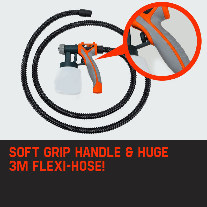 The two piece body is designed to decrease user fatigue, featuring a convenient telescopic trolley handle to make moving the motor around effortless. You simply park it next to you so your hands are kept free for spraying. One of the notable benefits of operating a High Volume Low Pressure (HVLP) system is that you don't need to lug around a heavy, costly air compressor. Moreover, the ergonomic soft-grip handle with multi-directional adjustable fluid nozzle connects to a massive 3m flexi-hose so you can flow through your DIY projects without having to move anything at all.
