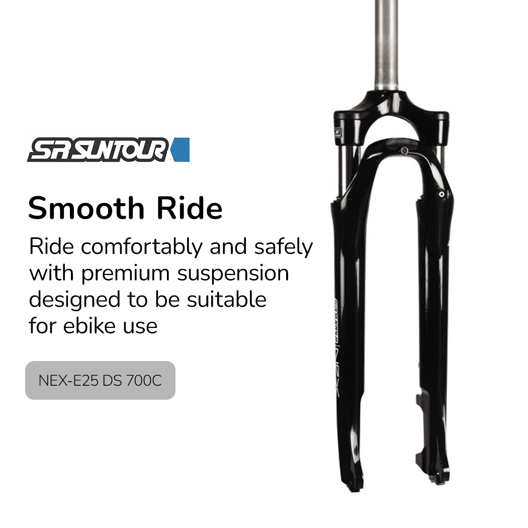 Suntour is one of the world's renowned suspension brands and the NEX E-25 model is specifically designed to cater for the added weight of e-bikes. With 63mm of travel it is ideal for safe and enjoyable urban usage.