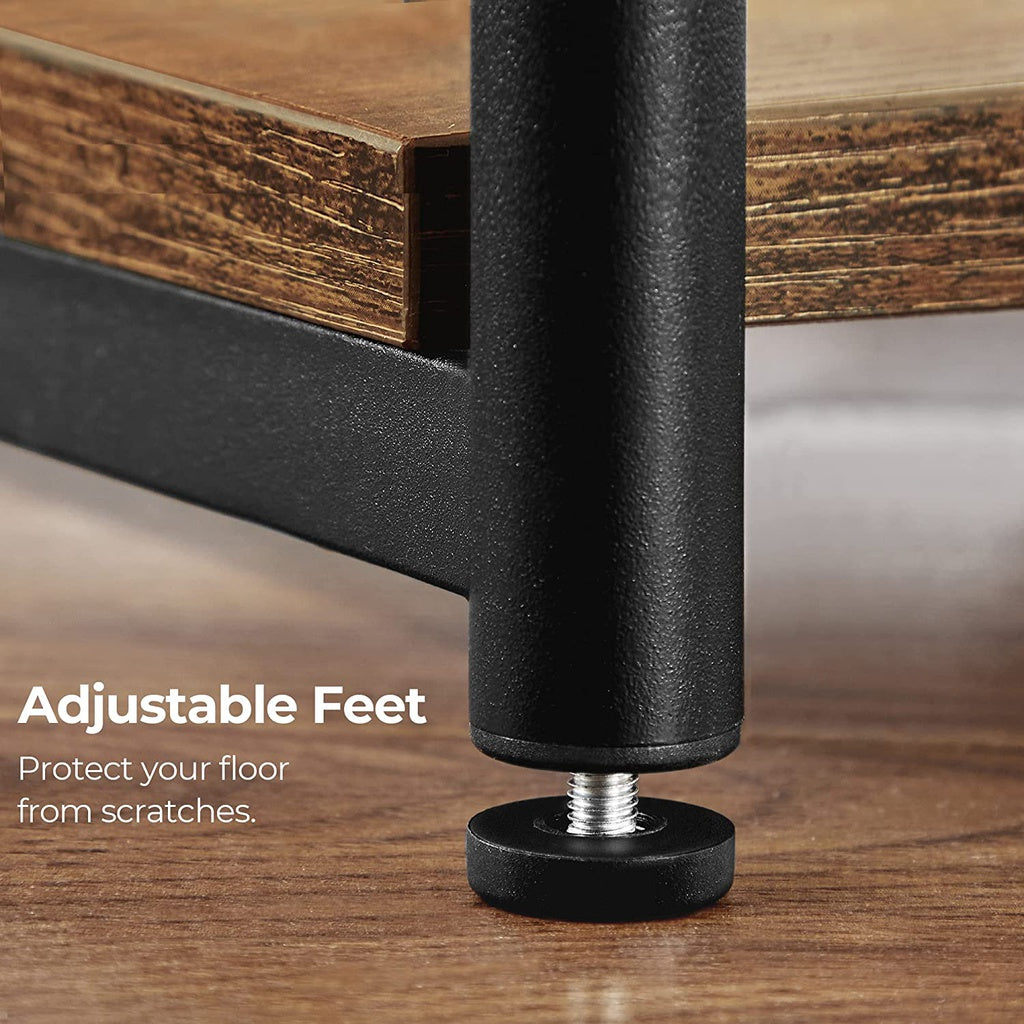 - Strong Yet Stable: 2 steel side frames lift and brace 2 particleboard panels, making a solid structure that stays put after loaded with 44 lb of items on each tier. Small unevenness in the floor? The feet are adjustable to even it out
