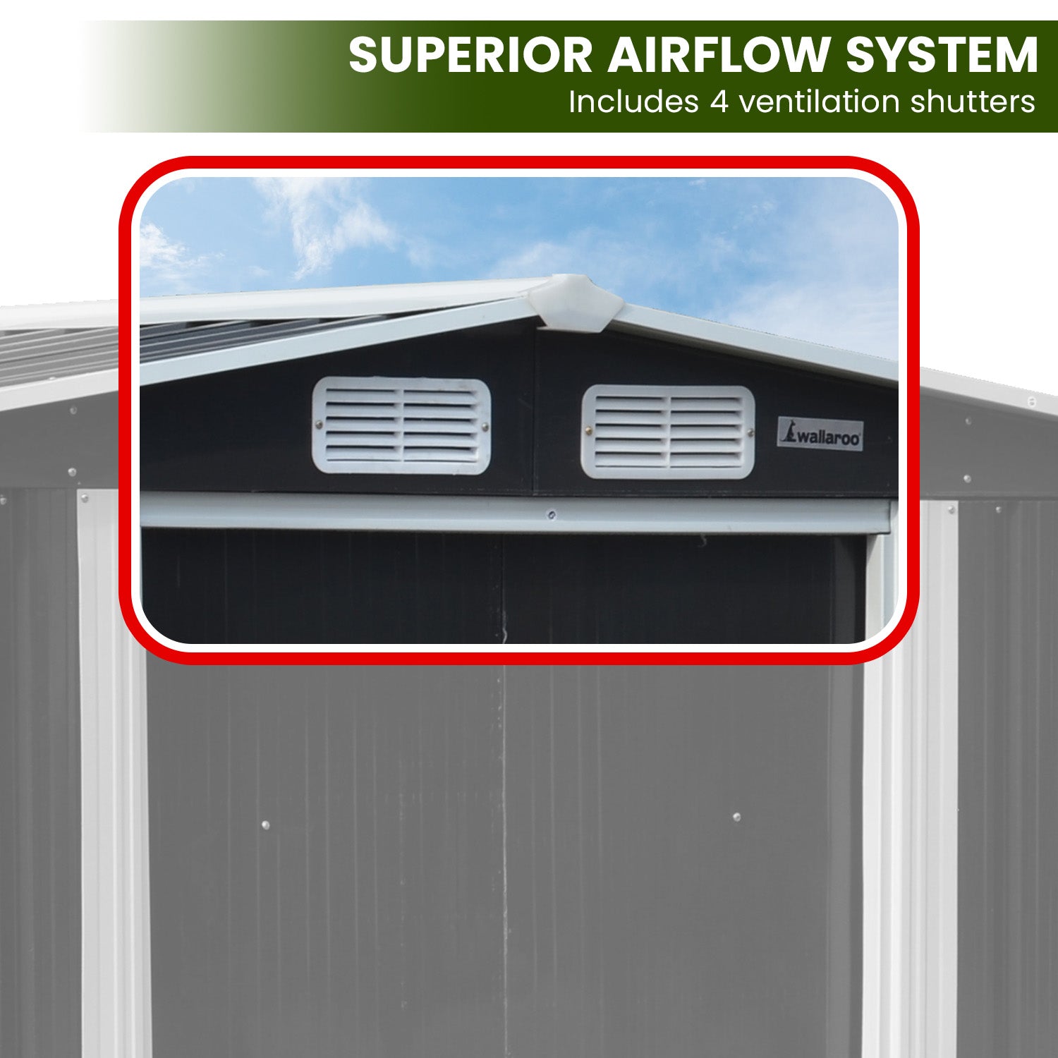 Built with a 23 gauge steel frame and galvanized steel sheets, this sturdy shed is corrosion-resistant and made to last years under the Australian sun. It also features four ventilation shutters for quality airflow, leaving your tools and materials free from mildew and fume build-up.